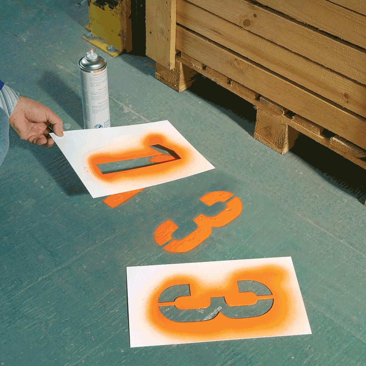 Schablonensatz Nr. 4 zum Aufsprühen von Buchstaben und Zahlen zur Markierung auf dem Boden, für deutliche und randscharfe Ergebnisse, mehrfach benutzbar, mit allen Sprüh- und Bodenfarben verwendbar