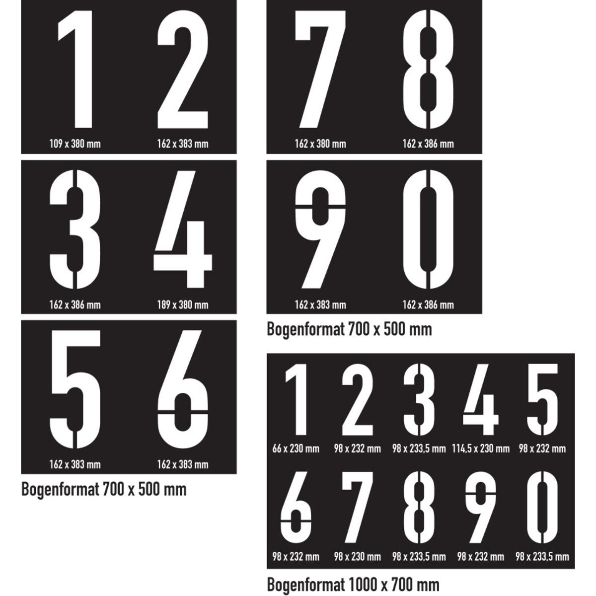 Schablonensatz Nr. 2 zum Aufsprühen von Zahlen von 0 bis 9 zur Markierung auf dem Boden, für deutliche und randscharfe Ergebnisse, mehrfach benutzbar, mit allen Sprüh- und Bodenfarben verwendbar
