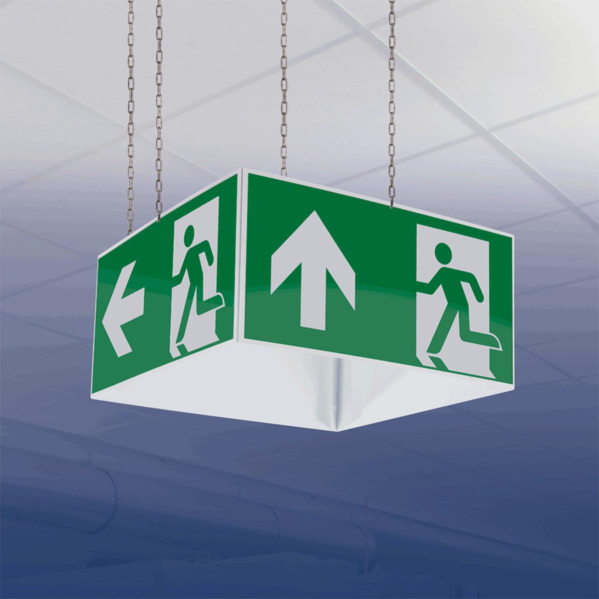 Auswahl: Notausgangswürfel, Notausgang geradeaus/rechts/links/blanko, ASR/ISO, Kunststoff