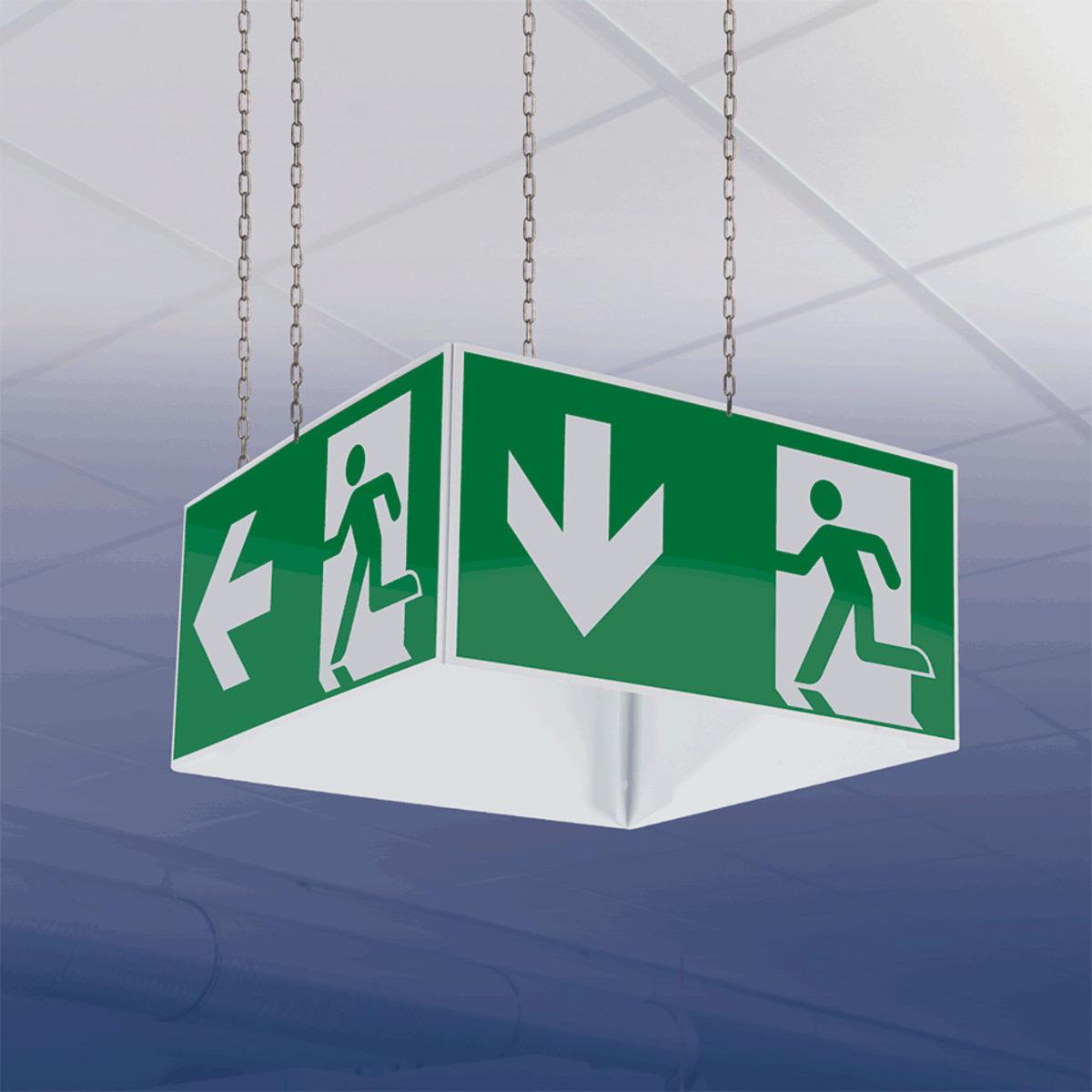 Auswahl: Notausgangswürfel, Notausgang unten/rechts/links/blanko, ASR/ISO, Kunststoff