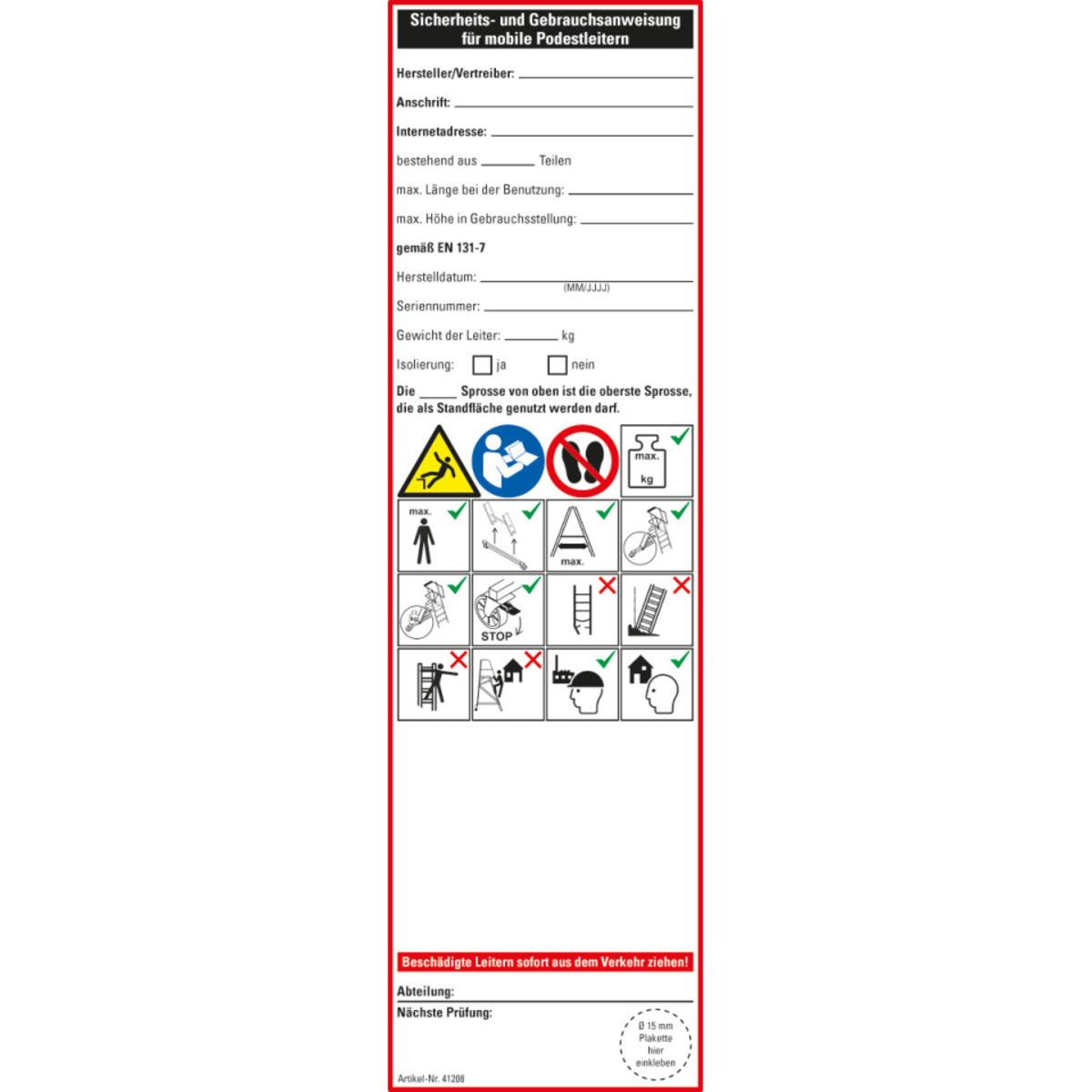 Selbstklebende Sicherheits- und Gebrauchsanweisung, welche die vorgeschriebene Prüfung von Leitern und Tritten auf deren ordnungsgemäßen Zustand erleichtert. Mit einem Prüffeld für kleine Prüfplaketten.