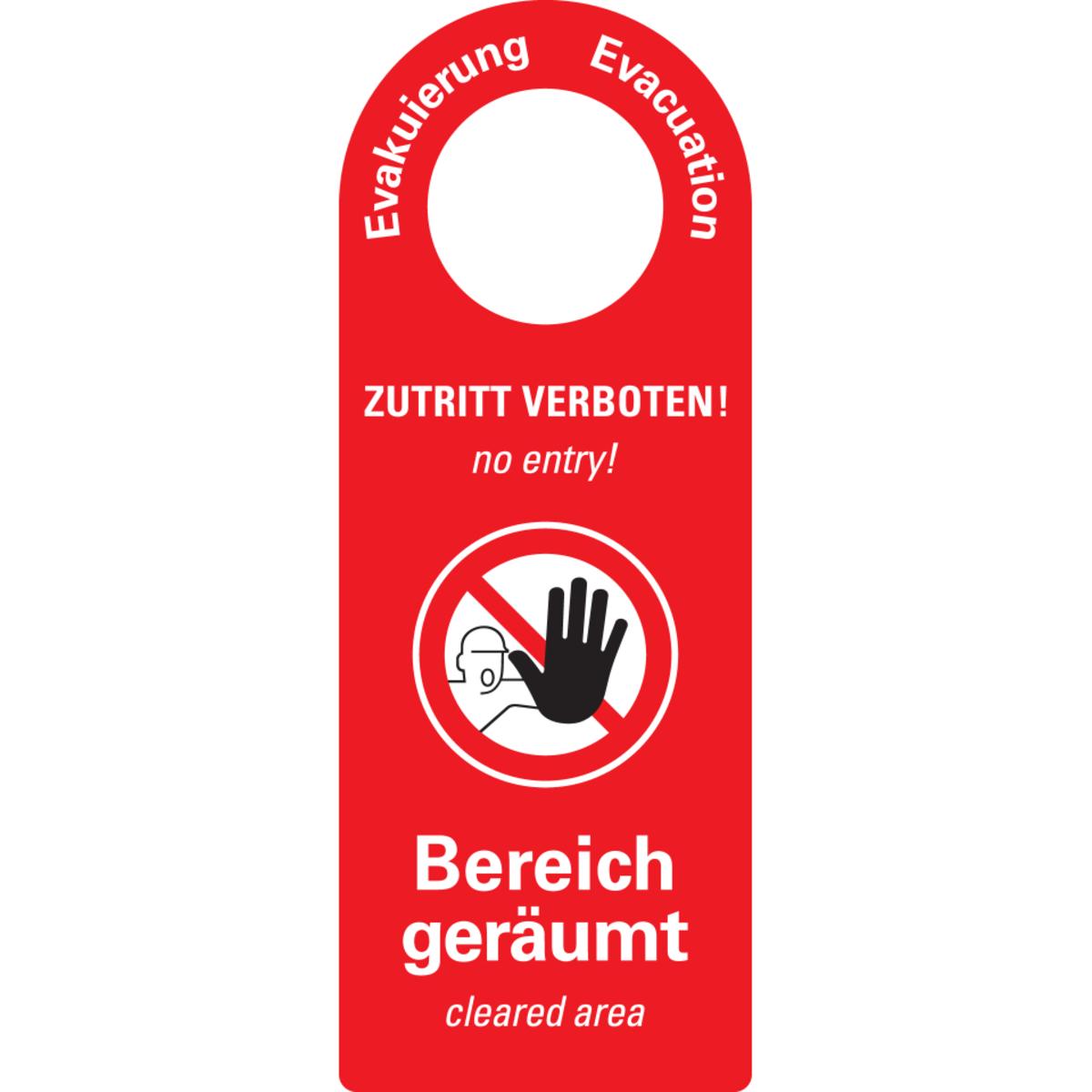 Auswahl: Türgriffanhänger Evakuierung Zutritt verb.geräumt, rot, Kunststoff, 70x185mm, 10/VE