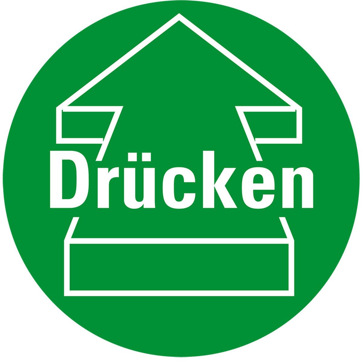 Auswahl: Türhinweis Drücken mit Pfeil, verhindert Stoßverletzungen, grün, Folie, Ø 100mm