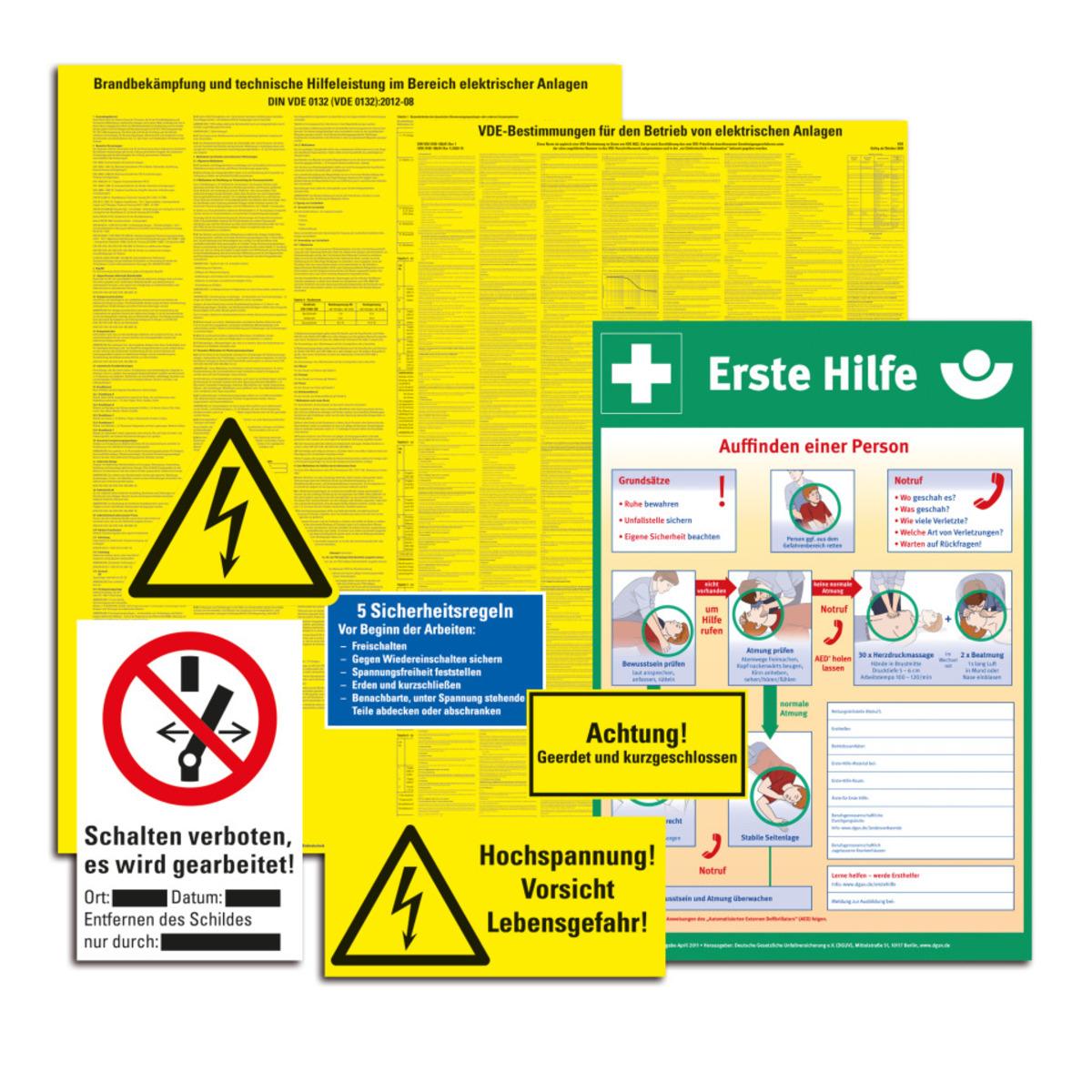 Auswahl: Warn- und Hinweisschildersatz, DIN VDE 0105, Kunststoff, verschiedene Formate