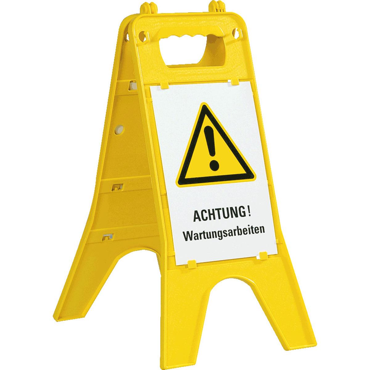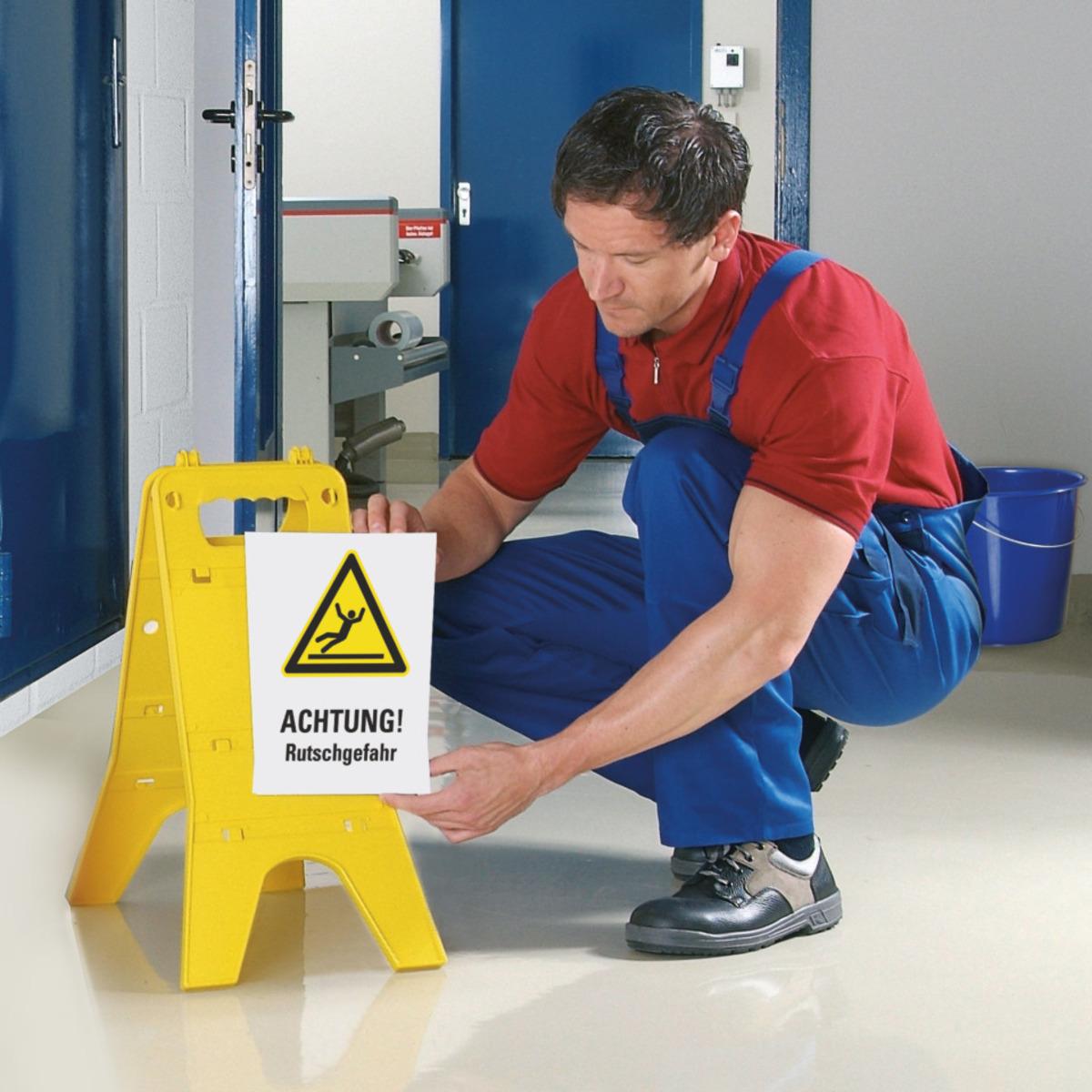 - individuell anpassbare Schilder für Gefahrensituationen wie "Rutschgefahr", "Wartungsarbeiten", "Durchgang verboten" oder "Frisch gestrichen"