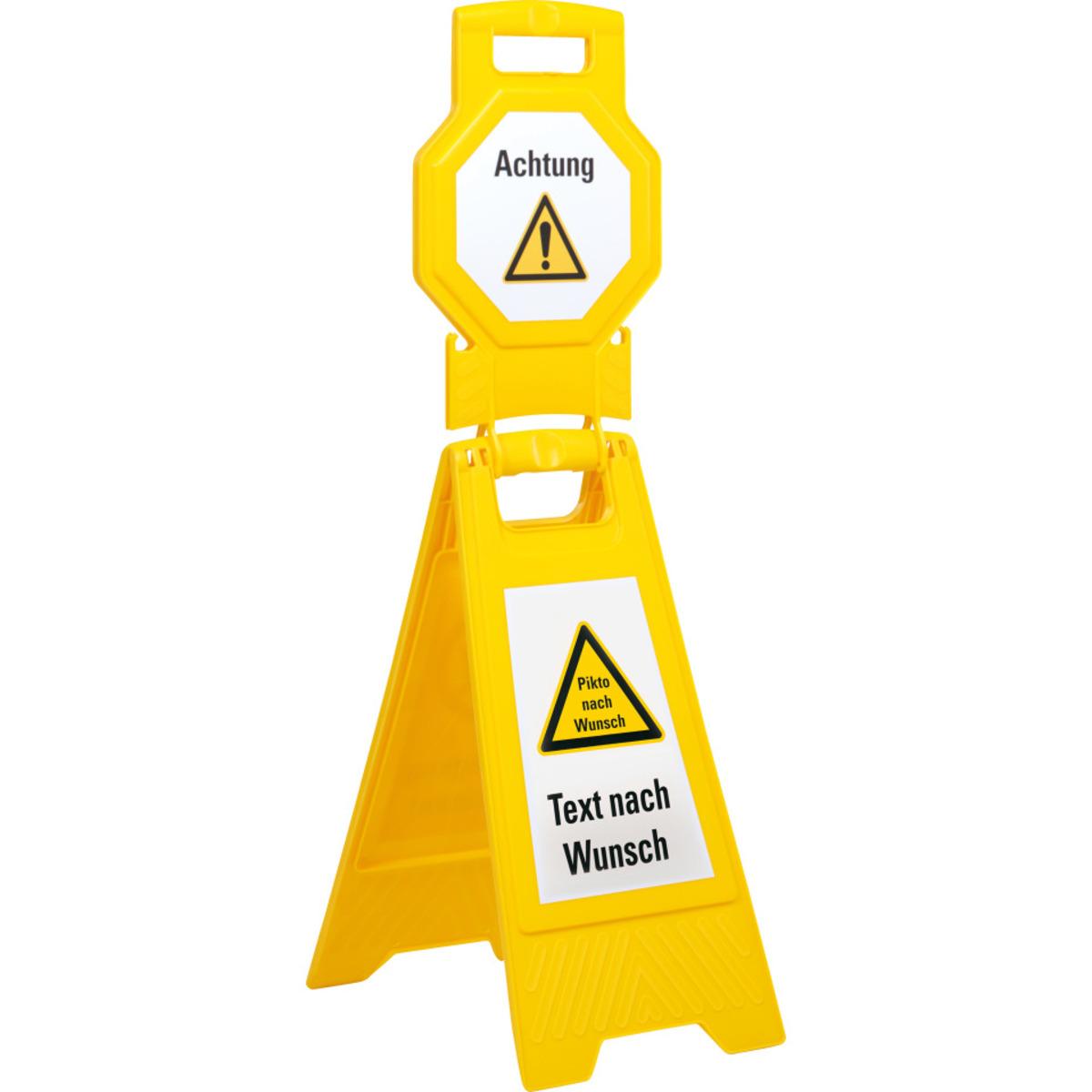 Der Warnaufsteller Hoch ist beidseitig mit Folie beschriftet mit Text und Pikto nach Wunsch. Der klappbare Teil oben ist mit dem allgemeinen Warnzeichen "Achtung" beschriftet und erreicht damit eine hohe Gesamthöhe von 1 m. Er ist platzsparend auf 620 mm zusammenklappbar.