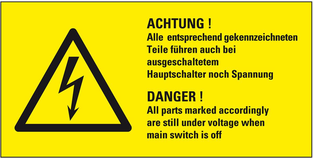 Gefahren müssen gut sichtbar gekennzeichnet werden. Mit dem praxisbewährten Kombi-Warnschild "Achtung! Alle entsprechend gekennzeichneten Teile führen auch bei ausgeschaltetem Hauptschalter noch Spannung" weisen Sie in Wort und Bild auf bestehende Gefahren hin und tragen so zum Schutz Ihrer Mitarbeiter, Besucher und/oder Passanten bei.
