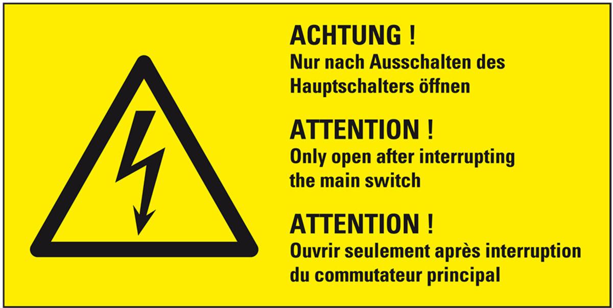 KSIGN Warnschild ACHTUNG Nur nach Ausschalten des Hauptschalters öffnen deutsch, englisch, französisch praxisbewährt