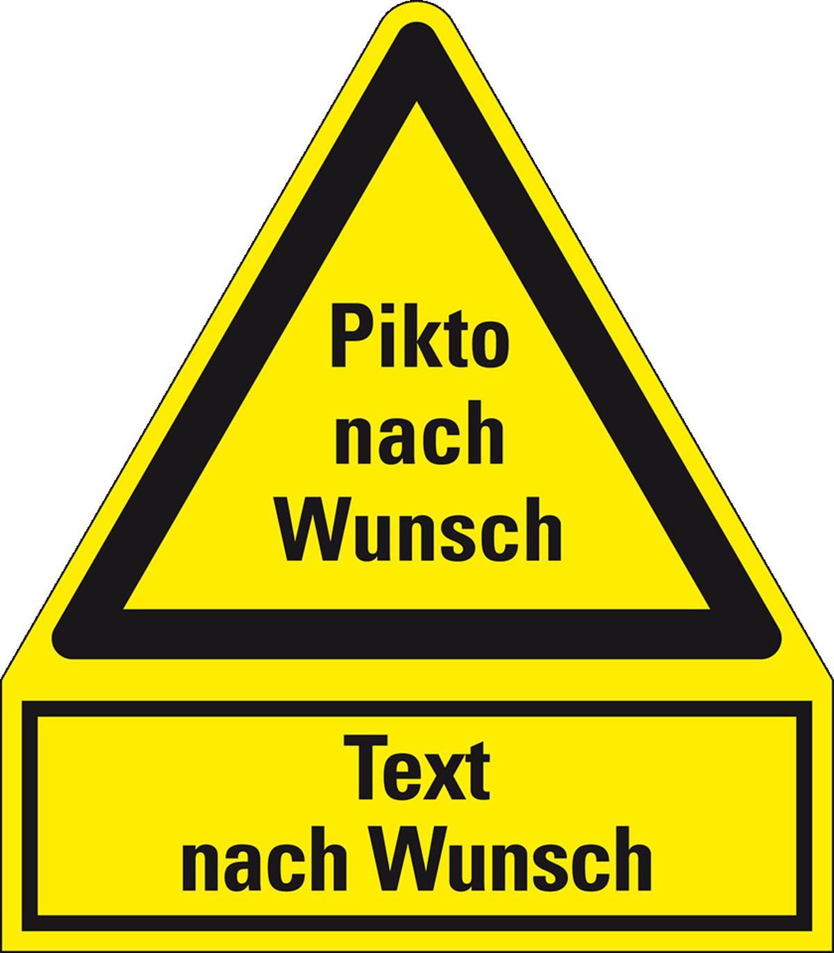 Gefahren müssen gut sichtbar gekennzeichnet werden. Mit dem Kombi-Warnschild mit Text und Pikto nach Wunsch weisen Sie in Wort und Bild auf bestehende Gefahren hin und tragen so zum Schutz Ihrer Mitarbeiter, Besucher und/oder Passanten bei.