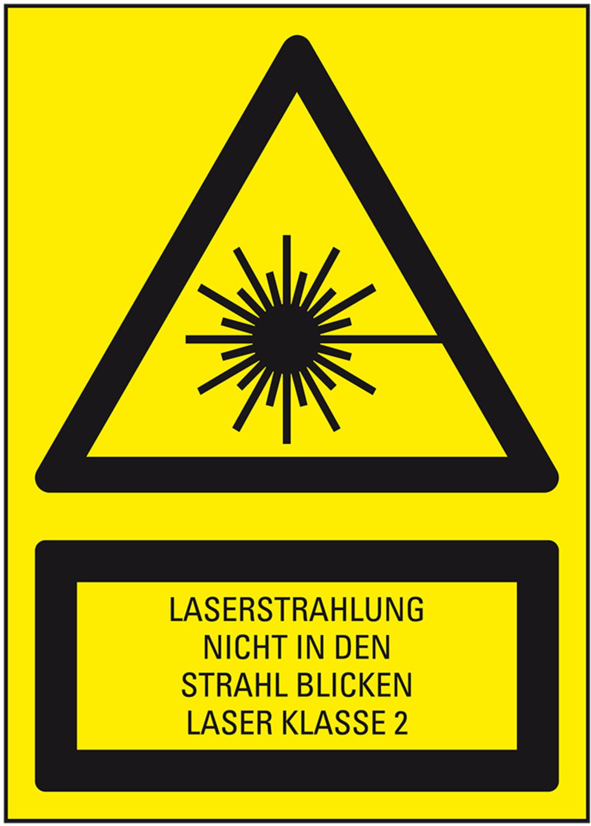 Gefahren müssen gut sichtbar gekennzeichnet werden. Mit dem Kombi-Warnschild "Laserstrahlung - Nicht in den Strahl blicken - Laser Klasse 2" weisen Sie in Wort und Bild auf bestehende Gefahren hin und tragen so zum Schutz Ihrer Mitarbeiter, Besucher und/oder Passanten bei.