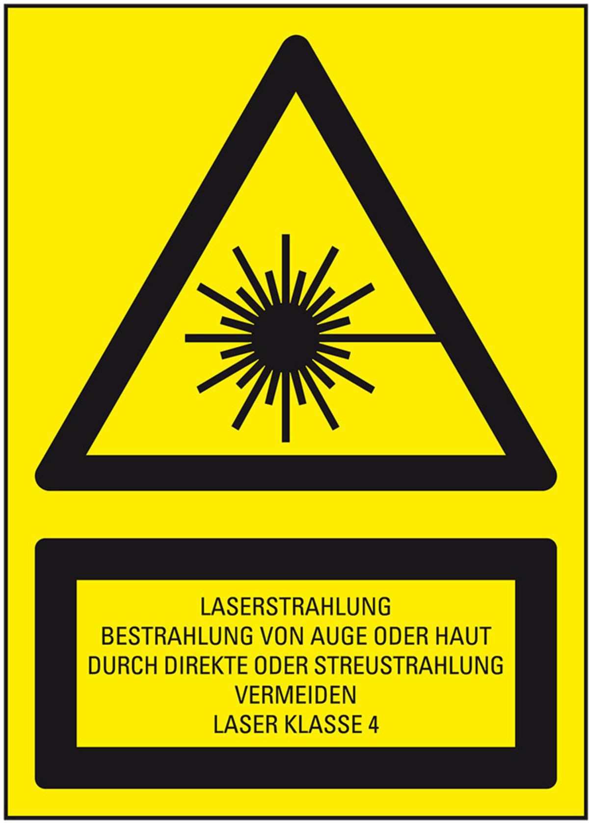 Gefahren müssen gut sichtbar gekennzeichnet werden. Mit dem Kombi-Warnschild "Laserstrahlung - Bestrahlung von Auge oder Haut durch direkte oder Streustrahlung vermeiden - Laser Klasse 4" weisen Sie in Wort und Bild auf bestehende Gefahren hin und tragen so zum Schutz Ihrer Mitarbeiter, Besucher und/oder Passanten bei.