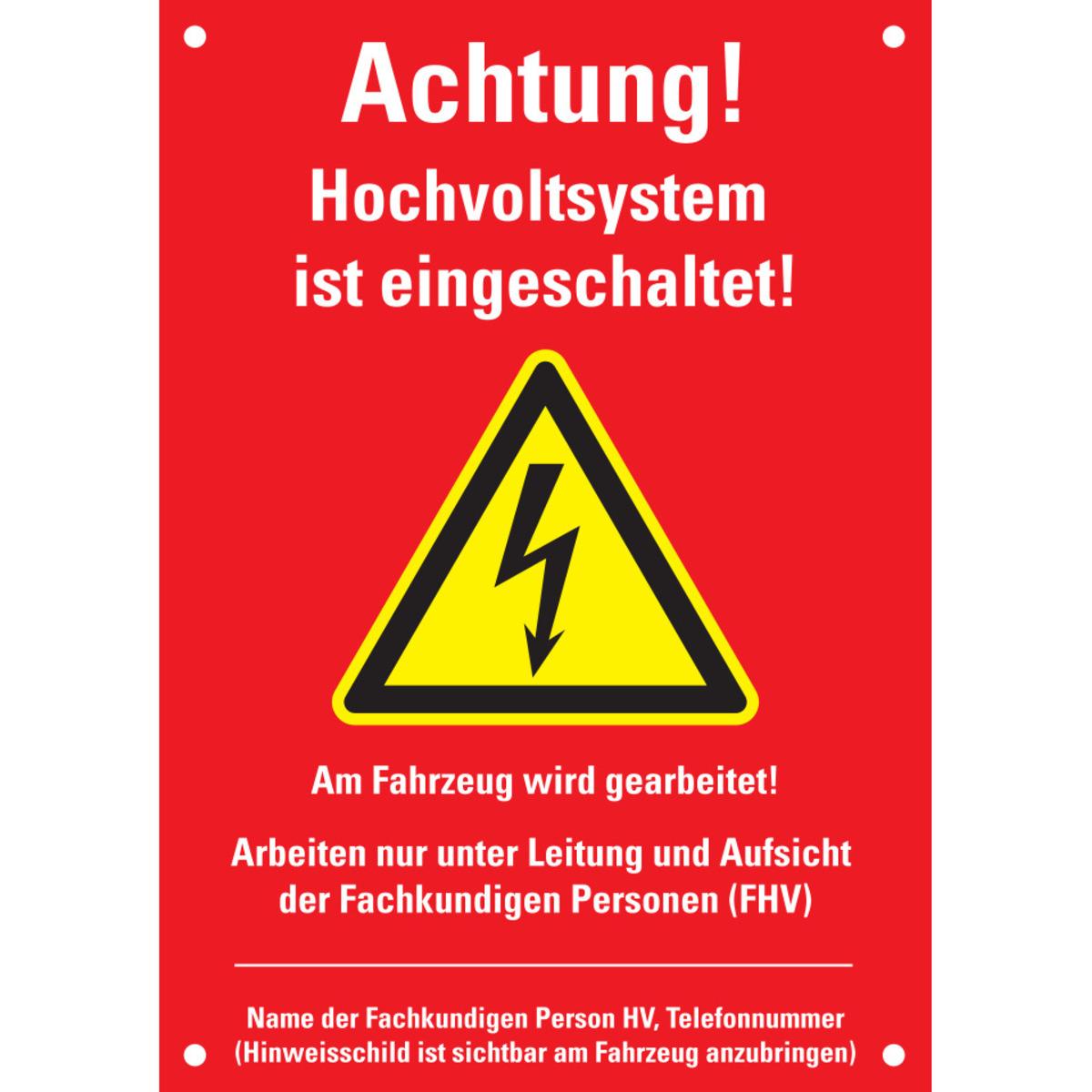 Schild zur Warnung vor eingeschalteter Hochvoltanlage, mit Freitextfeld zur manuellen Eintragung der fachkundigen Person für Hochvolt, zur Anbringung an Fahrzeugen