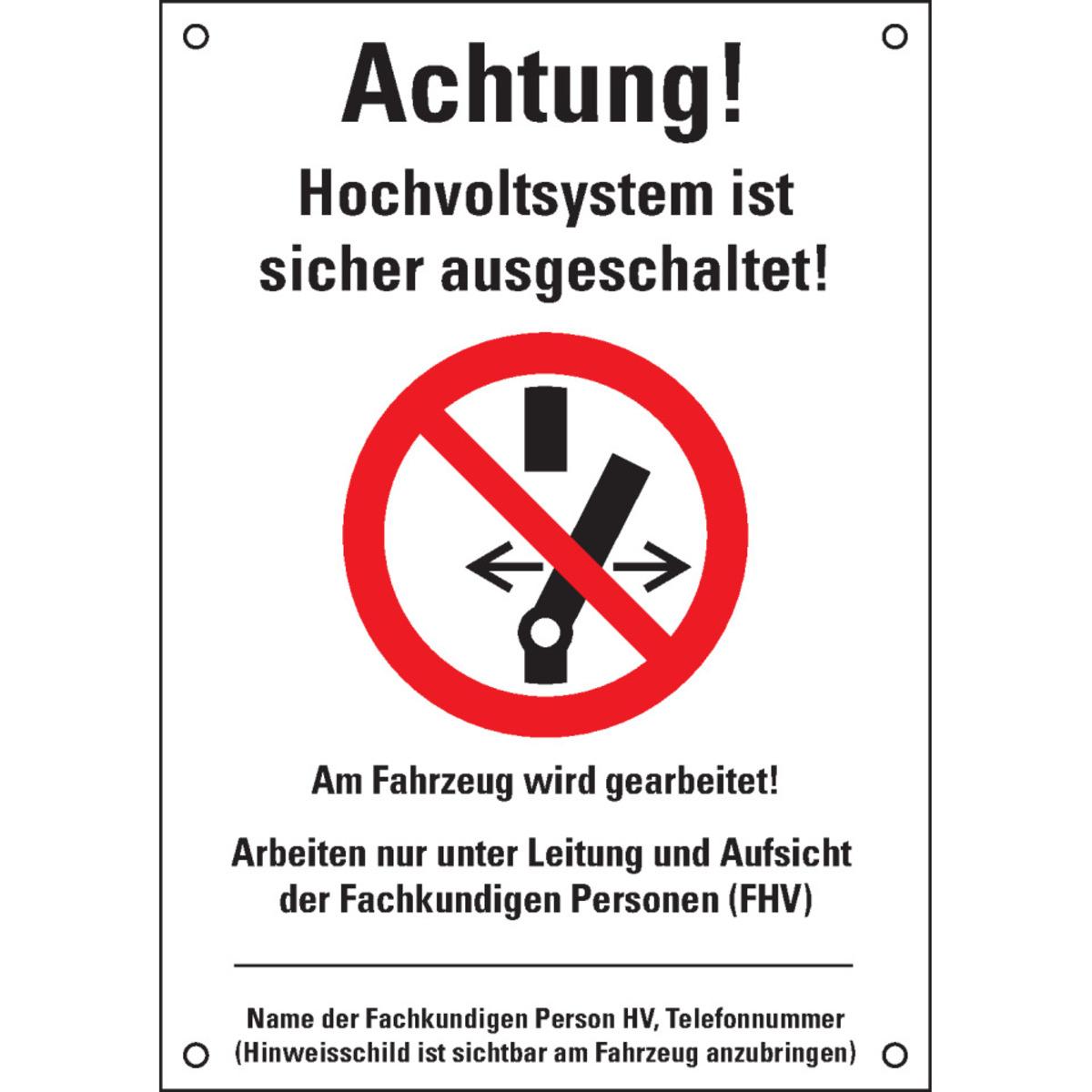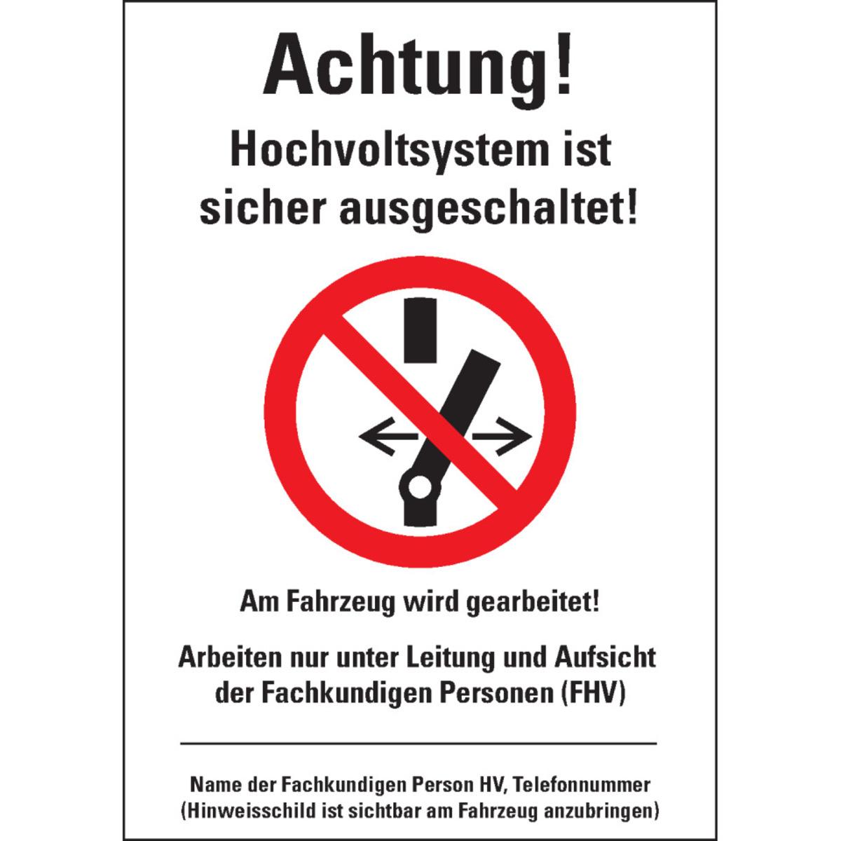 Warnzeichen mit Freitextfeld zur manuellen Eintragung der fachkundigen person für Hochvolt, zur Anbringung an Fahrzeugen