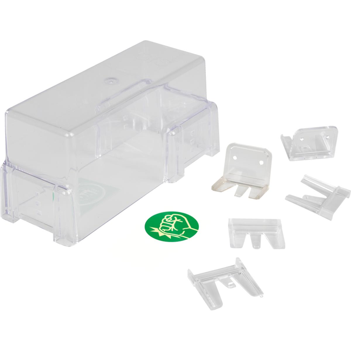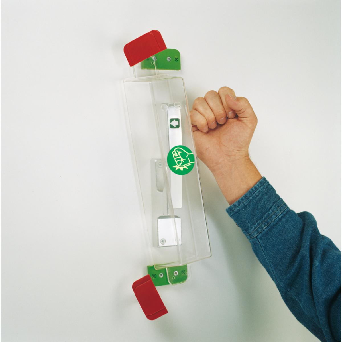 Die Plastikhaube arbeitet mit einem Sicherheitsverschluß, einer Sollbruchstelle und einer rot-grünen Kennzeichnung. Nach dem Abschlagen der Haube ist der Türgriff wie gewohnt zu verwenden. Durch die Farbgebung (rot-grün) kann man schon von weitem sehen, ob die Haube noch arretiert oder ob diese frei ist. Zum erneuten Sichern des Türgriffes bzw. zum Verschließen der Haube befestigt man nur die neuen roten Befestigungslaschen an den dafür vorgesehenen Montageorten.
