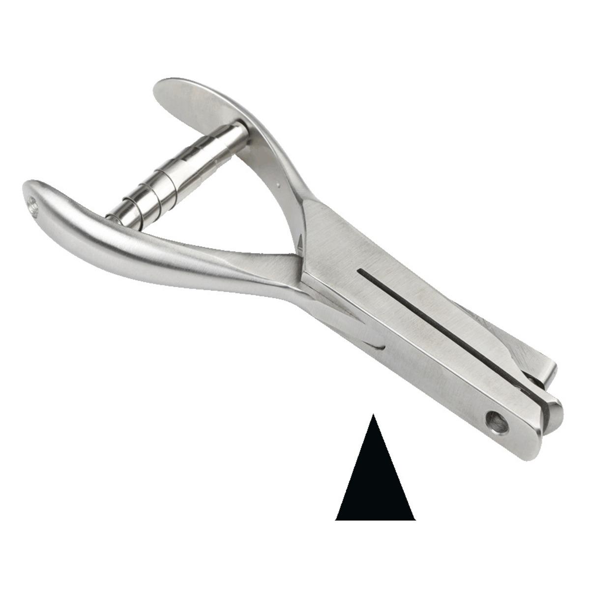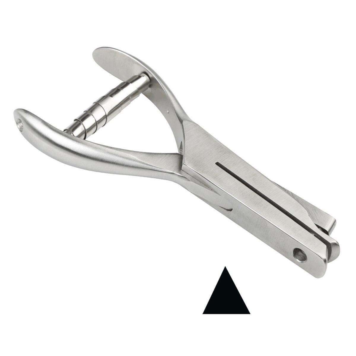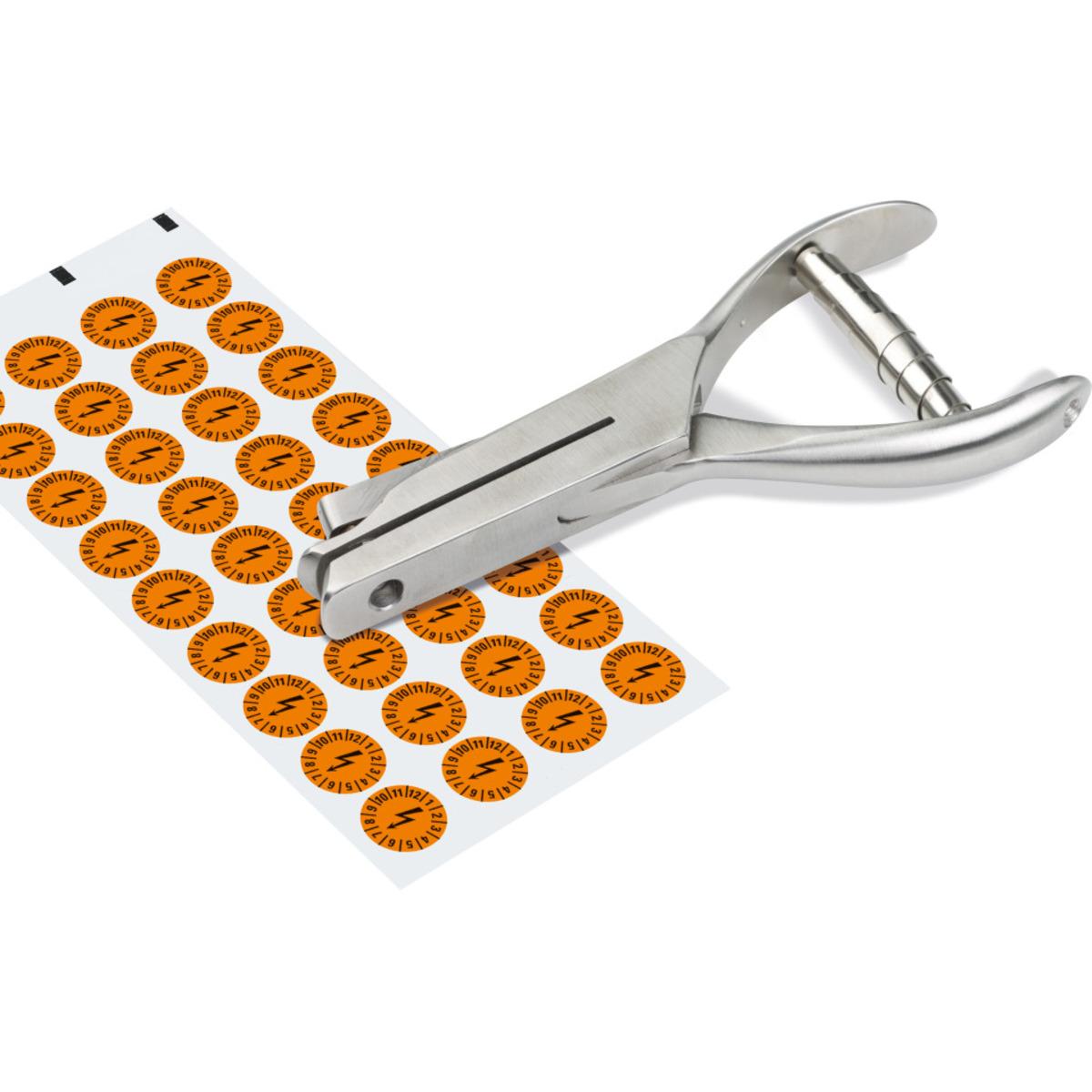 Lochzange mit verschiedenen Kerbformen zur Terminmarkierung von Prüfplaketten.