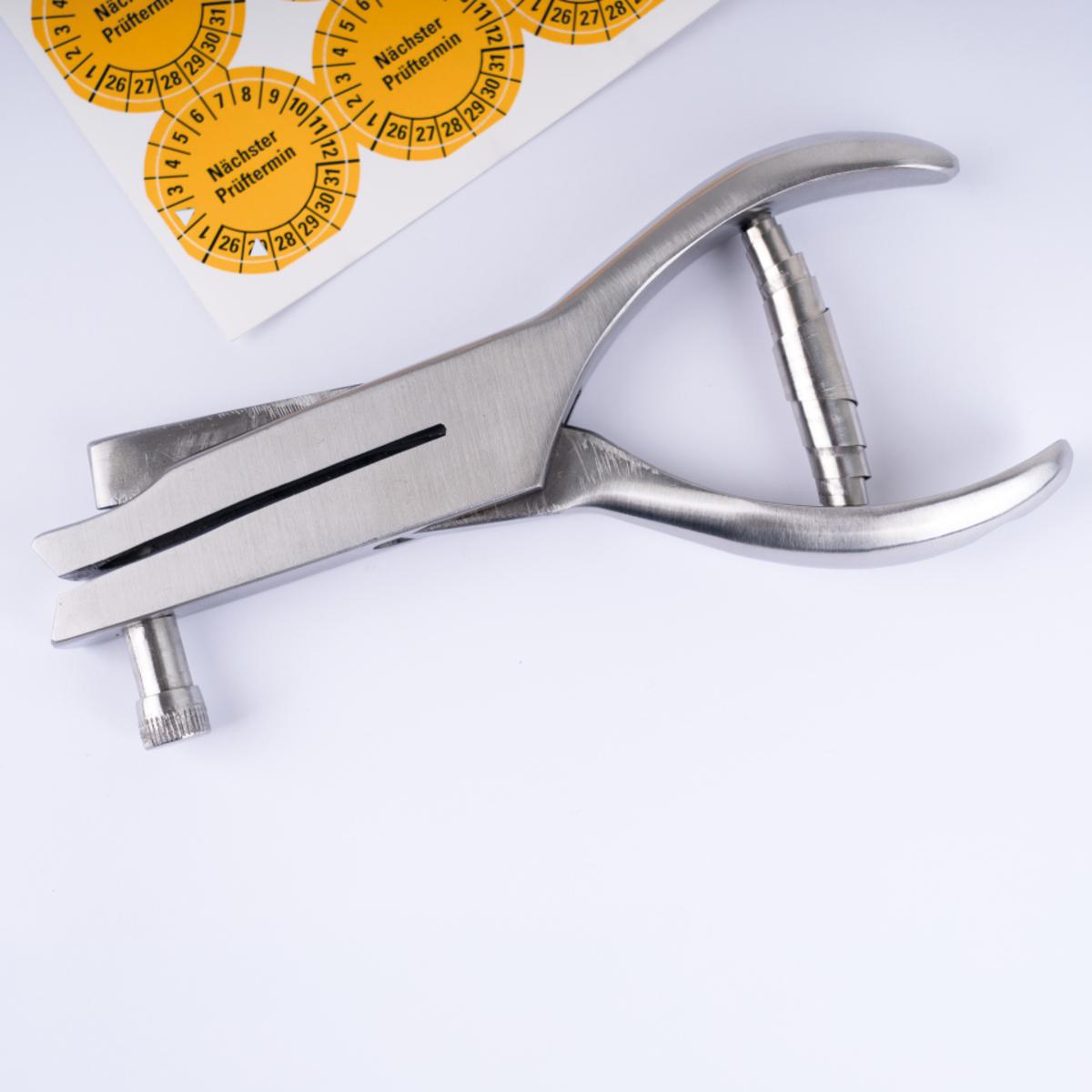 Lochzange mit verschiedenen Kerbformen zur Terminmarkierung von Prüfplaketten. Durch den integrierten Behälter werden die Ausstanzungen direkt aufgefangen und das Arbeitsumfeld so sauber gehalten. Universell einsetzbar für alle Verkaufseinheiten unserer Prüfplaketten.