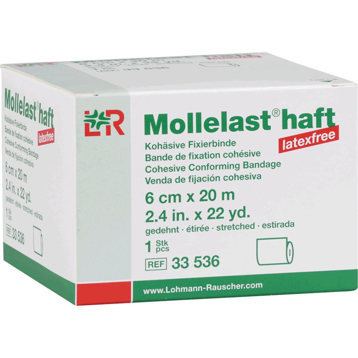 Mollelast® Haft Fixierbinde zur Fixierung von Wundauflagen oder als leichter Stützverband, auch an konischen Körperteilen und Gelenken. Selbsthaftend, elastisch, luftdurchlässig und hautverträglich.