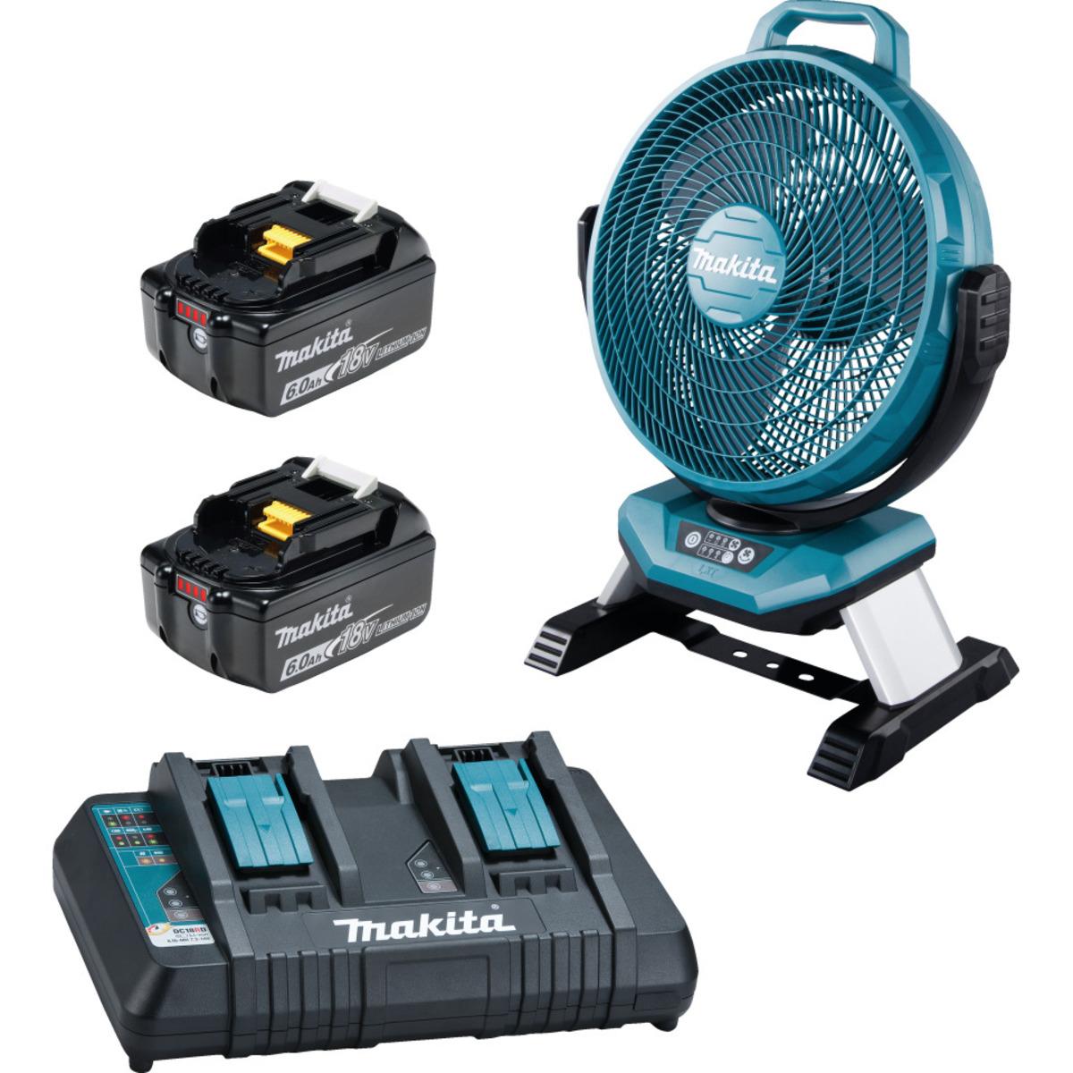 Makita Akku-Lüfter Set bestehend aus Akku-Lüfter DCF301Z, Akku und Ladegerät. Der Lüfter hat drei Luftstromeinstellungen und automatischer Drehbewegung, beschleunigt das Trocknen von Farbe oder Spachtelmasse und bietet zusätzlichen Komfort bei heißem Wetter, inkl. Doppel-Schnellladegerät DC18RD mit intelligenter Ladetechnologie und Kühlsystem für kurze Ladezeiten und LXT-Akku BL1860B mit Ladestandanzeige.