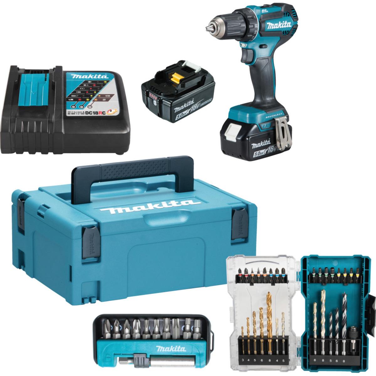 Vorteils-Set Makita Akku-Bohrschrauber inklusive Schnellladegerät, 2 Akkus, Koffersystem, Bohrer-Bit-Set und Bit-Set. Der Akku-Bohrschrauber DDF485RTJ ist ein handlicher 18 V Akku-Bohrschrauber mit einem 2-Gang-Vollmetall-Planetengetriebe und einem bürstenlosen Motor. Das Drehmoment ist in 21 Stufen plus Bohrstufe einstellbar. Zusätzlich ist eine leuchtstarke Doppel-LED mit Vor- und Nachglimmfunktion integriert.
