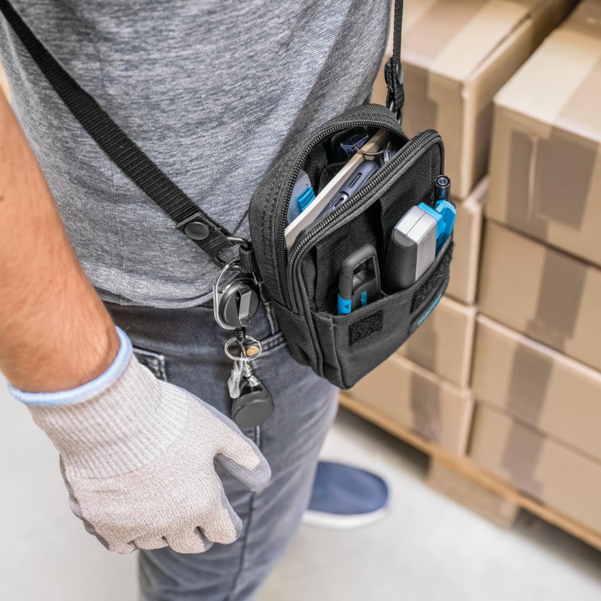 Die Tasche mit einem verschließbaren Innen- und einem Außenfach für Schneidewerkzeuge kann durch einen abnehmbaren Gurt als Umhänge- oder Hüfttasche getragen werden. Durch den Klettverschluss/Clip an der Rückseite ist sie direkt am Gürten oder der Hose zu befestigen.
