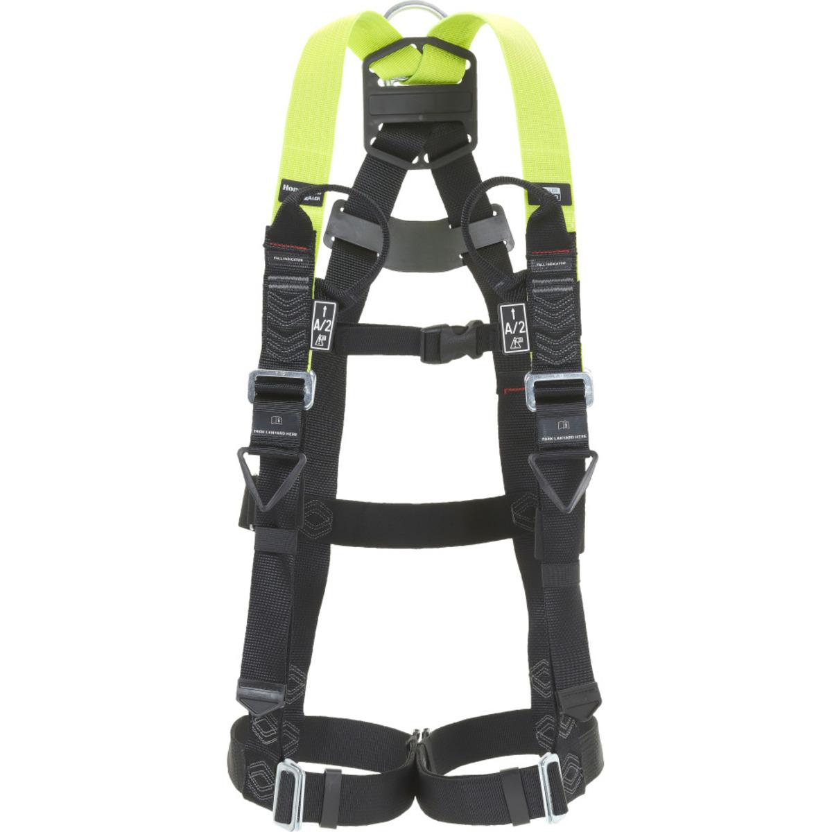 Leichter Honeywll Auffanggurt H500 mit ergonomisch geformter, druckentlastender und atmungsaktiver Polsterung, D-Ring Rückenöse, flexibles Gurtband für optimalen Komfort an Beinen und Schultern, lässt sich problemlos und ohne Verdrehen anlegen, HSG-Textilschlaufe zum einfachen Verbinden mit Höhensicherungsgeräten, auffällige Sturzindikatoren, Cobra-Schnellverschlussschnallen