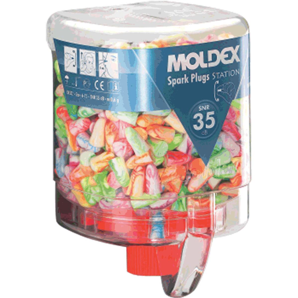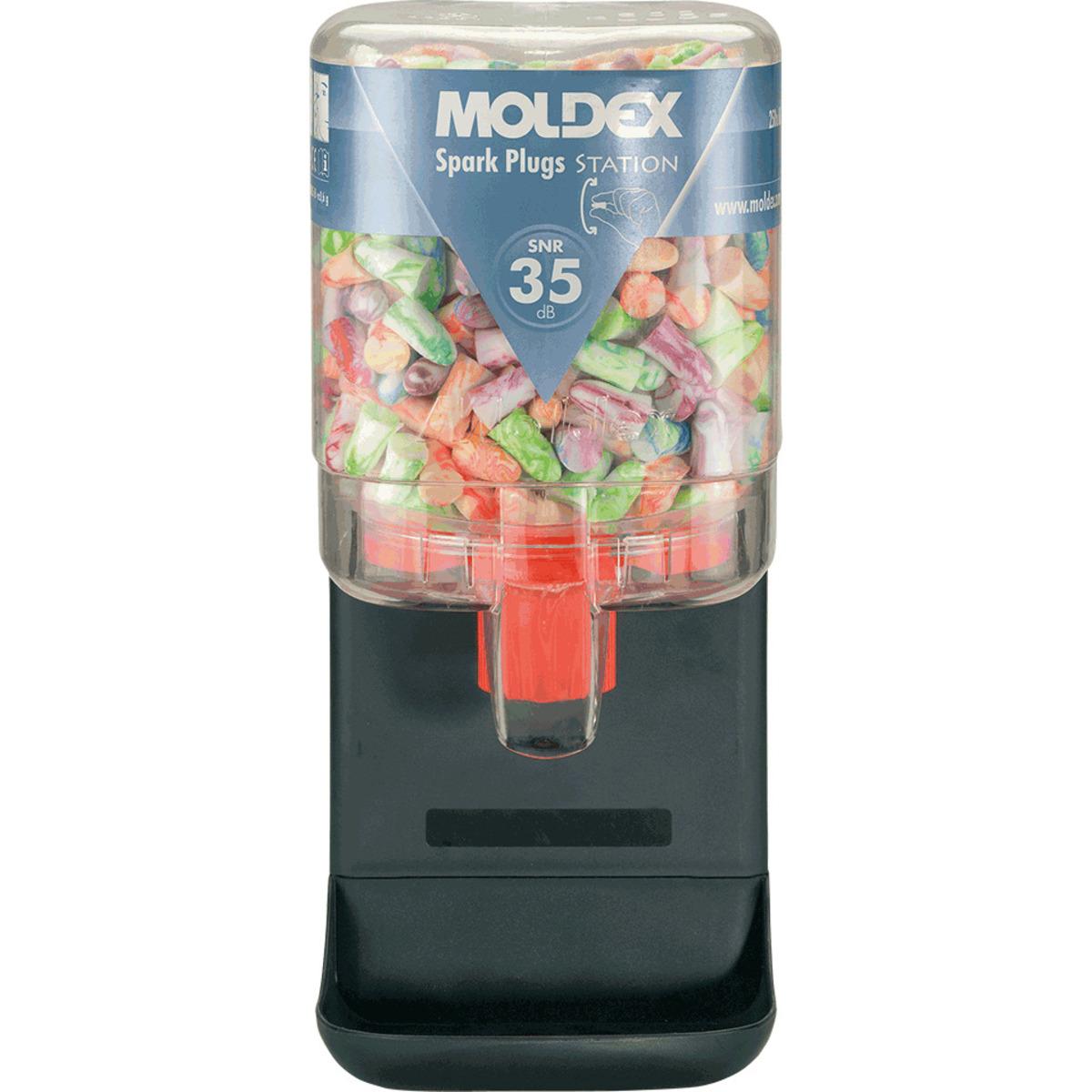 Farbige Gehörschutzstöpsel Moldex SPARK PLUGS aus weichem Schaum mit leicht taillierter Form für hohen Tragekomfort, schützen zuverlässig und druckfrei gegen Lärm, im praktischen Wandspenderaufsatz für einfaches und hygienisches Entnehmen der Stöpsel, einfach Aufsatz in die Wandhalterung einsetzen, Wandhalterung separat mitbestellen