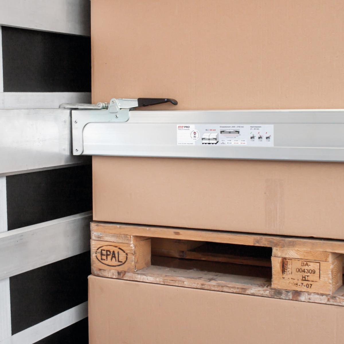Ausziehbarer, 2-teiliger Zwischenwandverschluss MTPro zur Sicherung des Transportguts gegen Verrutschen auf der Ladefläche, Endstück mit rutschhemmender Schutzkappe