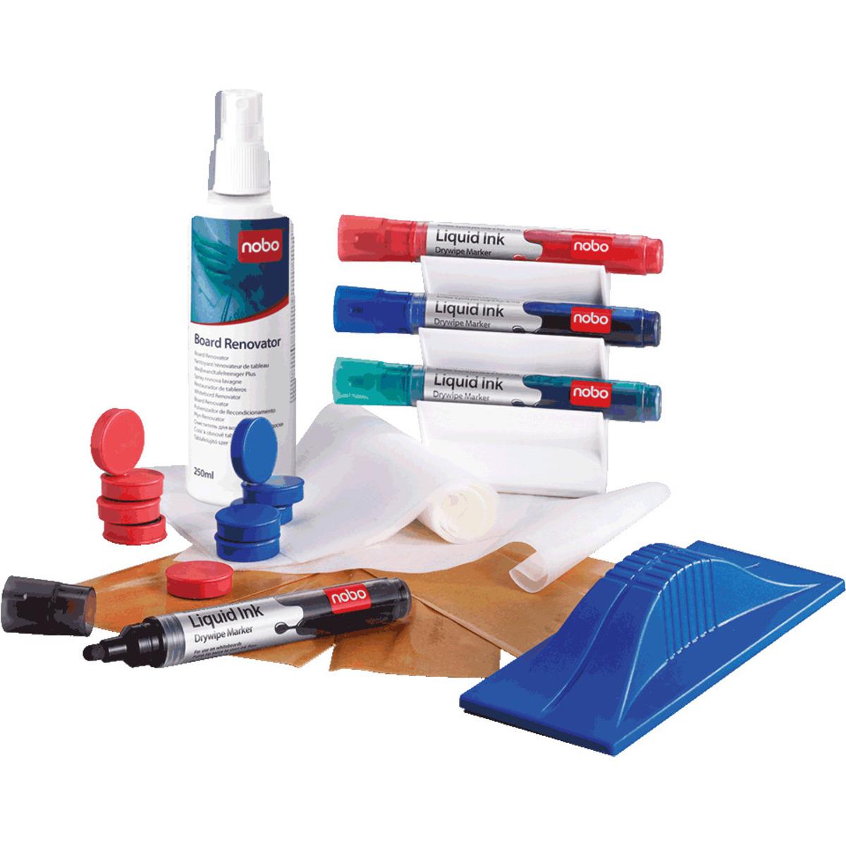Zubehör-Set, für nobo® Whiteboard Essence, bestehend aus 4 trocken abwischbaren Markern in den Farben schwarz, rot, grün und blau, 1 Tafelwischer, 5 Ersatzvlies für den Tafelwischer, 1 Flasche Reinigungsspray, Inhalt: 125 ml, 1 Mikrofaser-Reinigungstuch, 10 Magnete