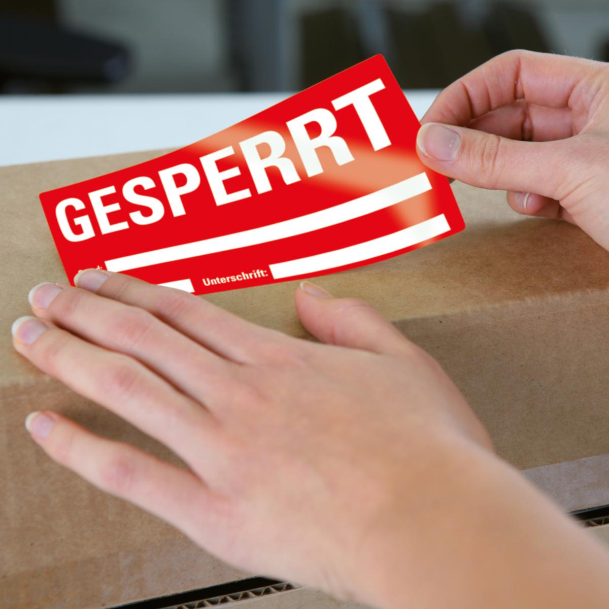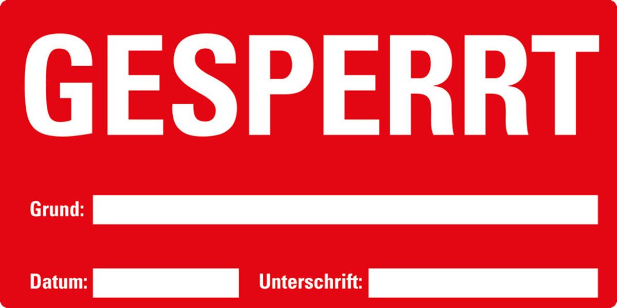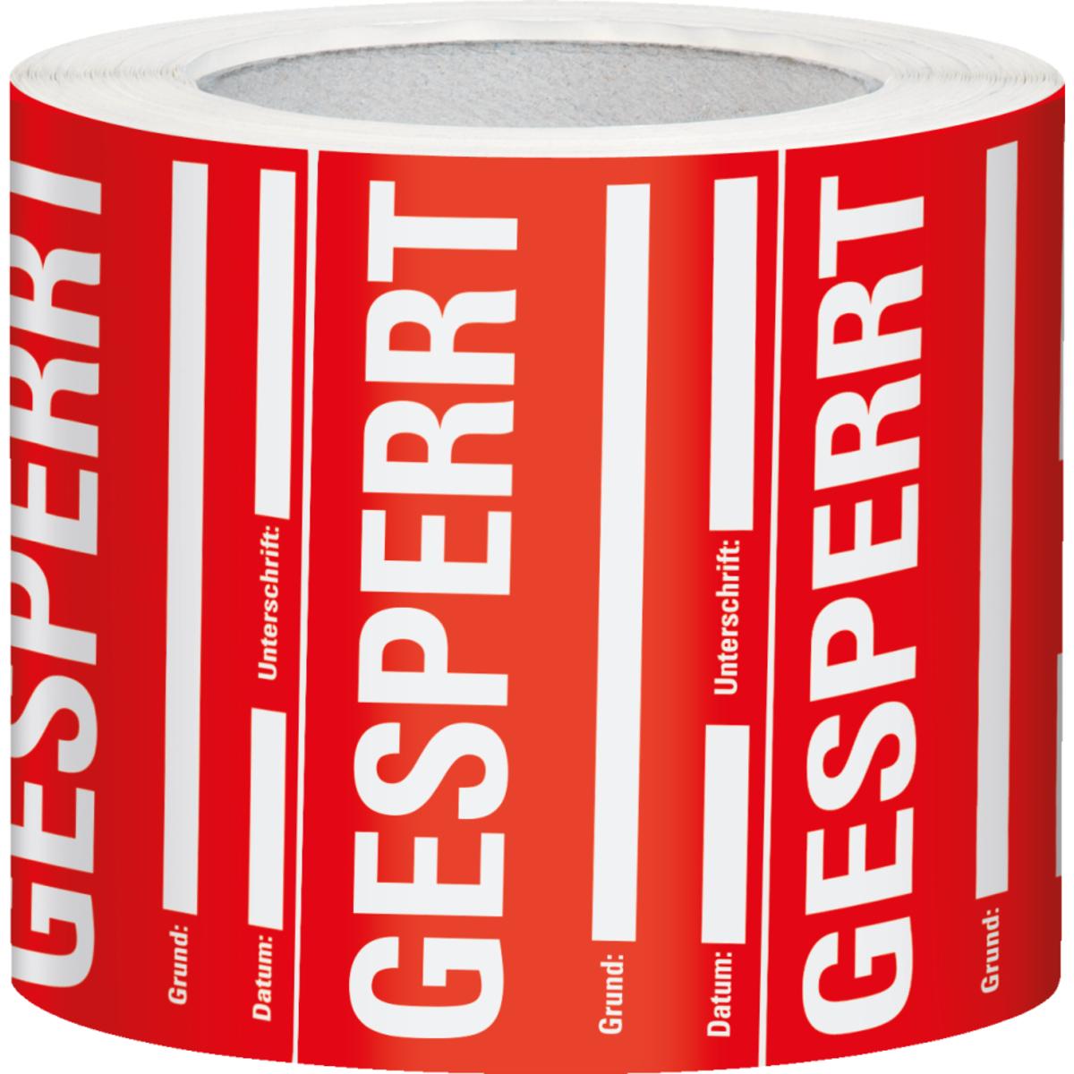 Auswahl: Etikett GESPERRT, beschriftbar, rot, Haftpapier, ablösbar, 148x74mm, 500/Rolle