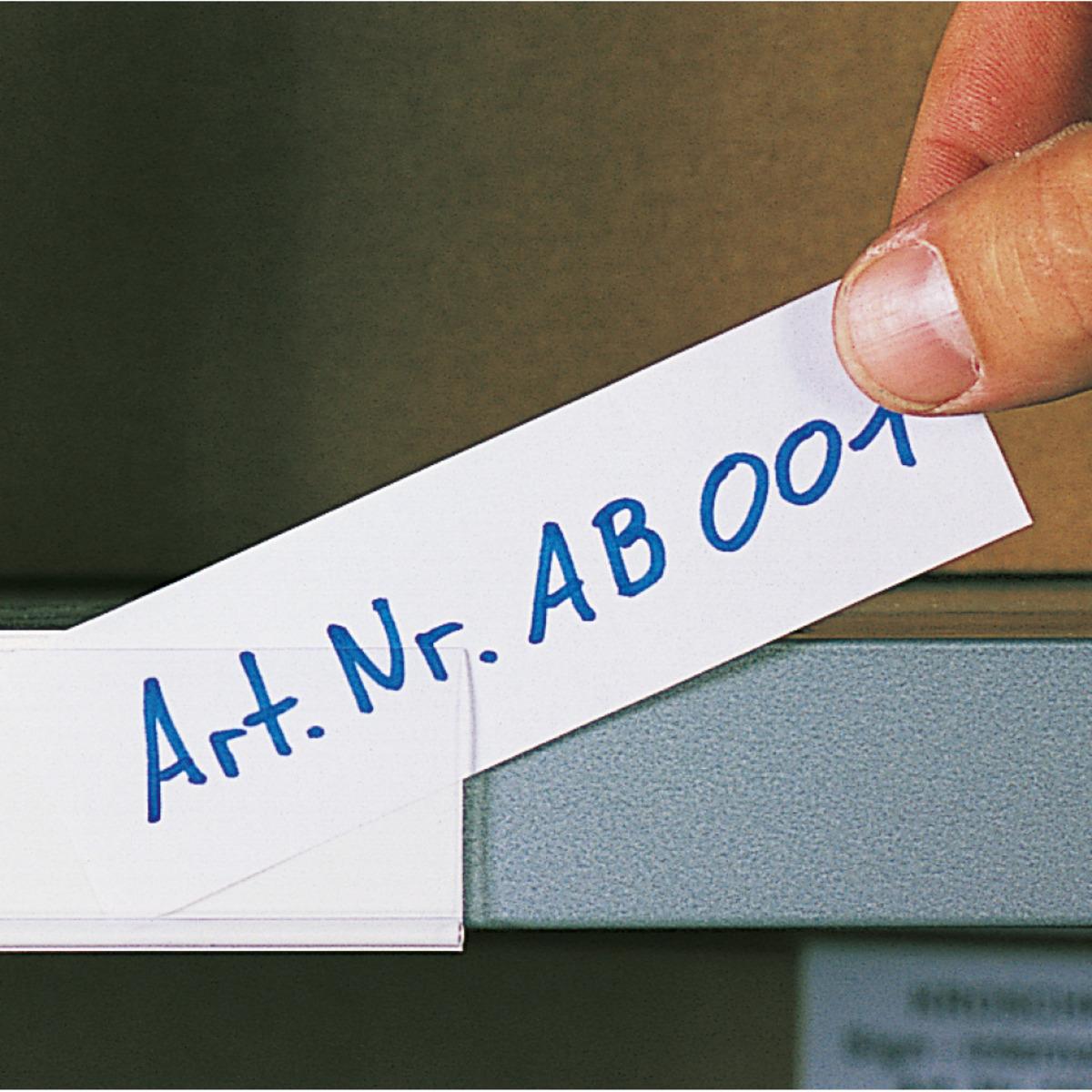Individuell beschriftbare Papieretiketten für den Einschub in selbstklebende Etikettenhalter.