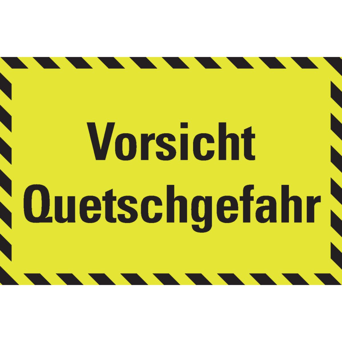 Auffälliges, lang nachleuchtendes Hinweisschild mit dem Aufdruck "Vorsicht! Quetschgefahr". Durch den schraffierten Rand wird eine erhöhte Aufmerksamkeit gewährleistet und unerlaubtem Zutritt vorgebeugt.