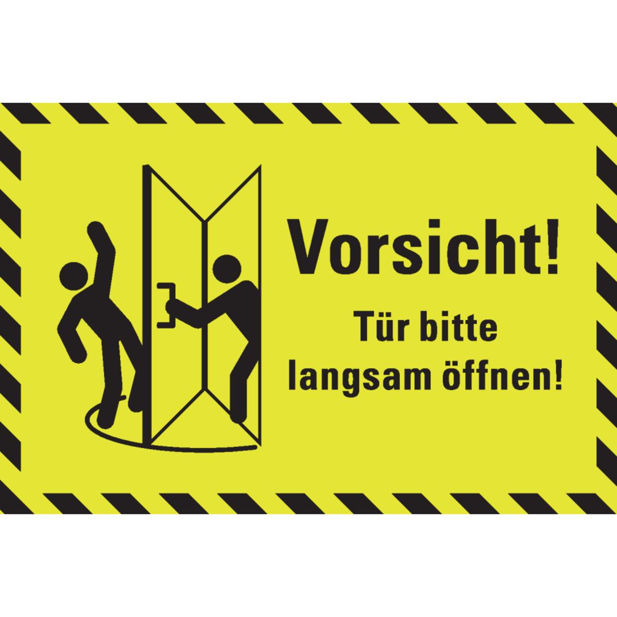 Auffälliges, lang nachleuchtendes Hinweisschild zur Warnung vor dem zu schnellen Öffnen von Türen. Durch den schraffierten Rand wird eine erhöhte Aufmerksamkeit gewährleistet und Unfällen vorgebeugt.