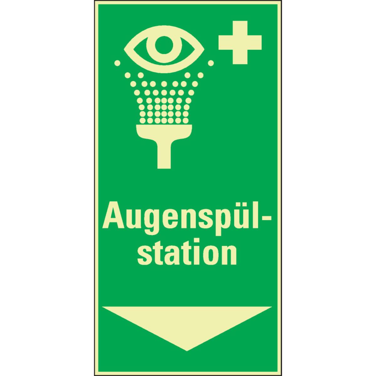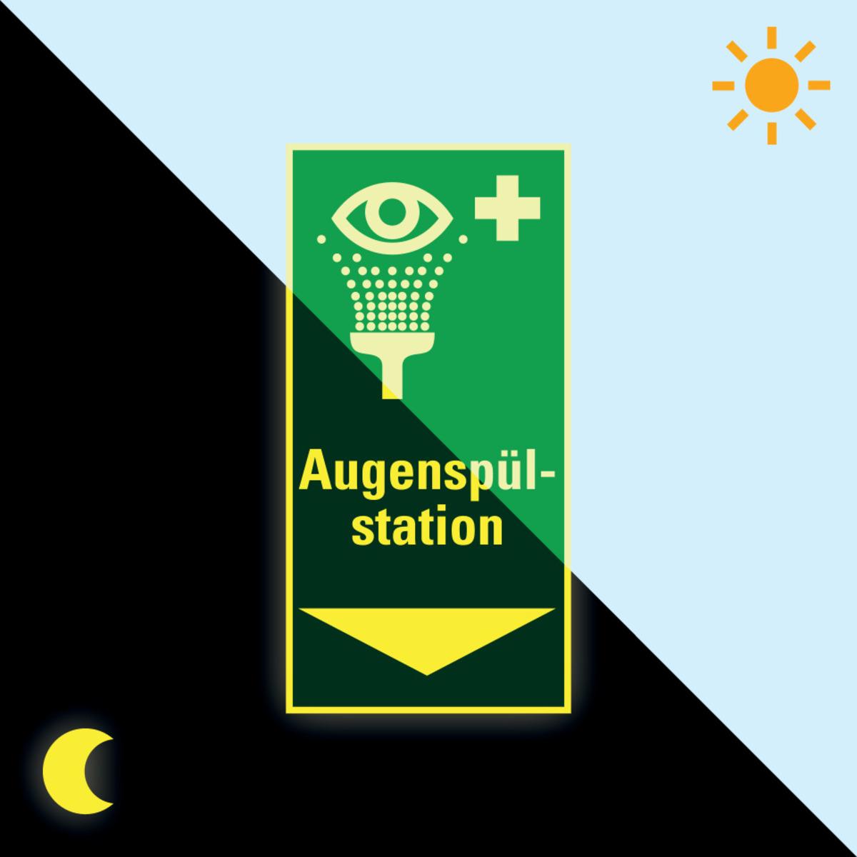 Mit dem langnachleuchtenden PERMALIGHT® power Kombi-Rettungszeichen "Augenspülstation Pfeil nach unten" schützen Sie Leben und Gesundheit Ihrer Mitarbeiter und/oder Besucher, indem Sie Rettungswege und Notfalleinrichtungen eindeutig kennzeichnen.