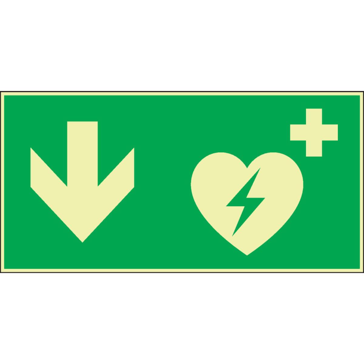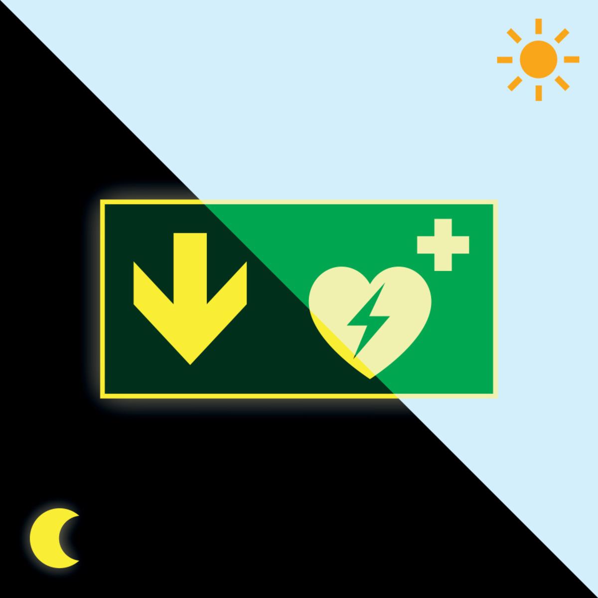 Mit dem langnachleuchtenden PERMALIGHT® power Rettungszeichen "Autom. ext. Defibrillator Pfeil nach unten" schützen Sie Leben und Gesundheit Ihrer Mitarbeiter und/oder Besucher, indem Sie Rettungswege und Notfalleinrichtungen eindeutig kennzeichnen.