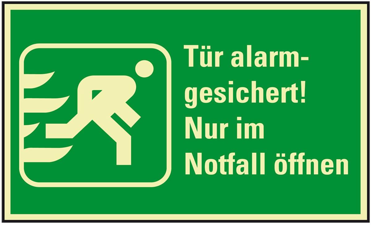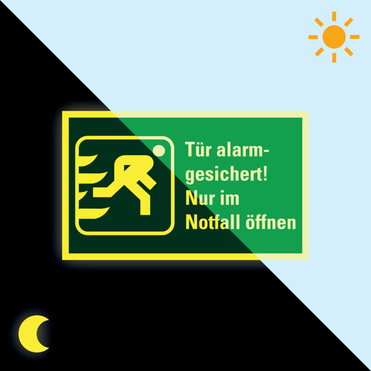 Mit dem langnachleuchtenden PERMALIGHT® power Rettungszeichen "Tür alarmgesichert! Nur im Notfall öffnen" schützen Sie Leben und Gesundheit Ihrer Mitarbeiter und/oder Besucher, indem Sie Rettungswege und Notfalleinrichtungen eindeutig kennzeichnen.