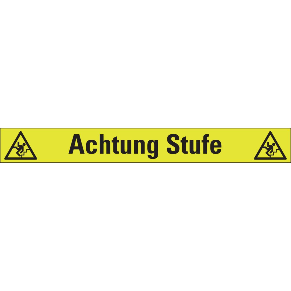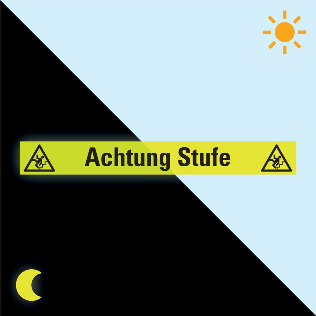 Tagesfluoreszierende, lang nachlechtende PERMALIGHT® Markierung von Treppenstufen mit dem Hinweis "Achtung Stufe" zur Vermeidung von Stolperunfällen