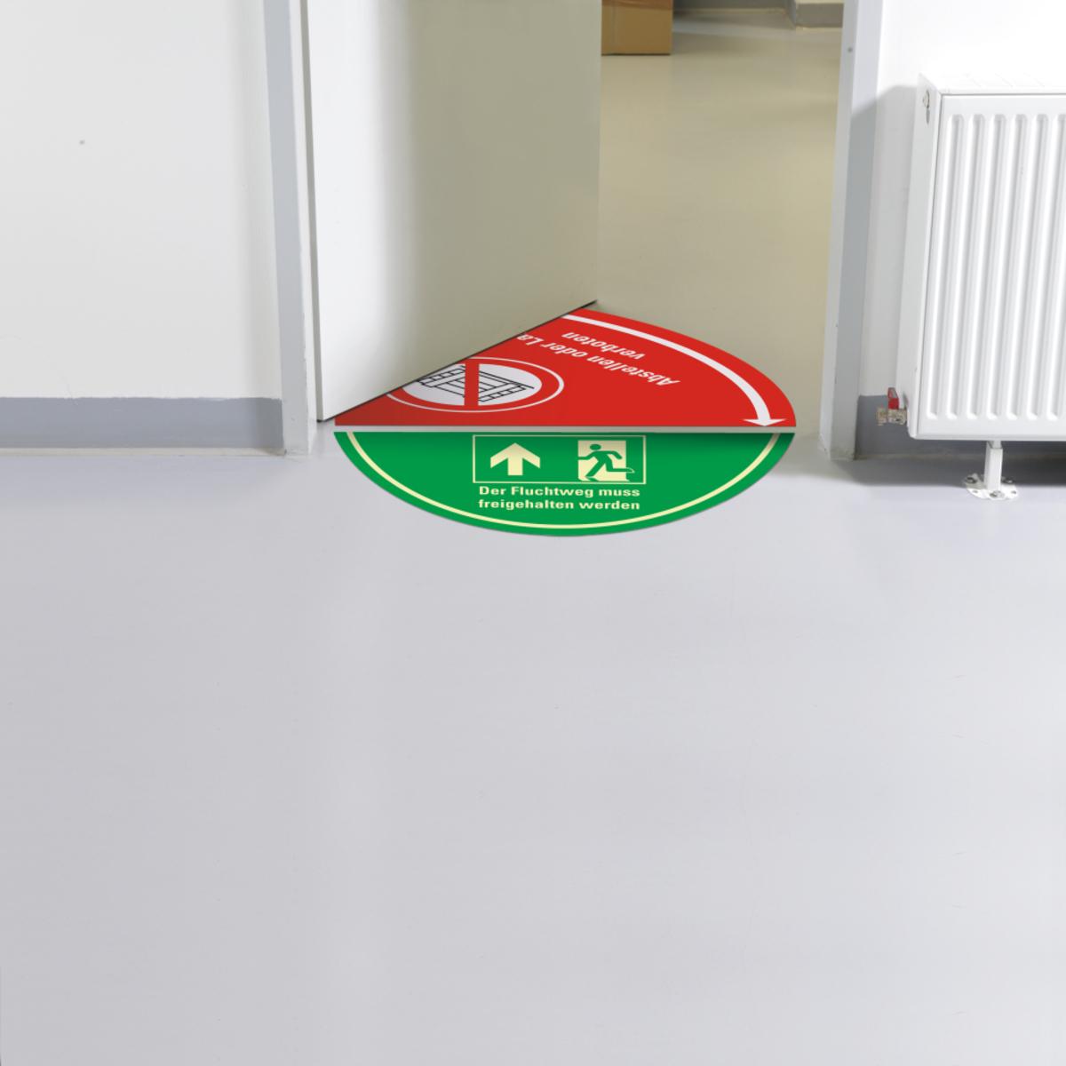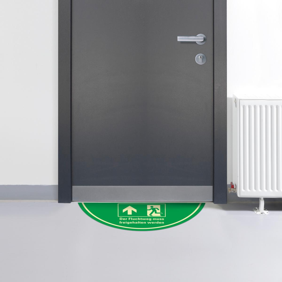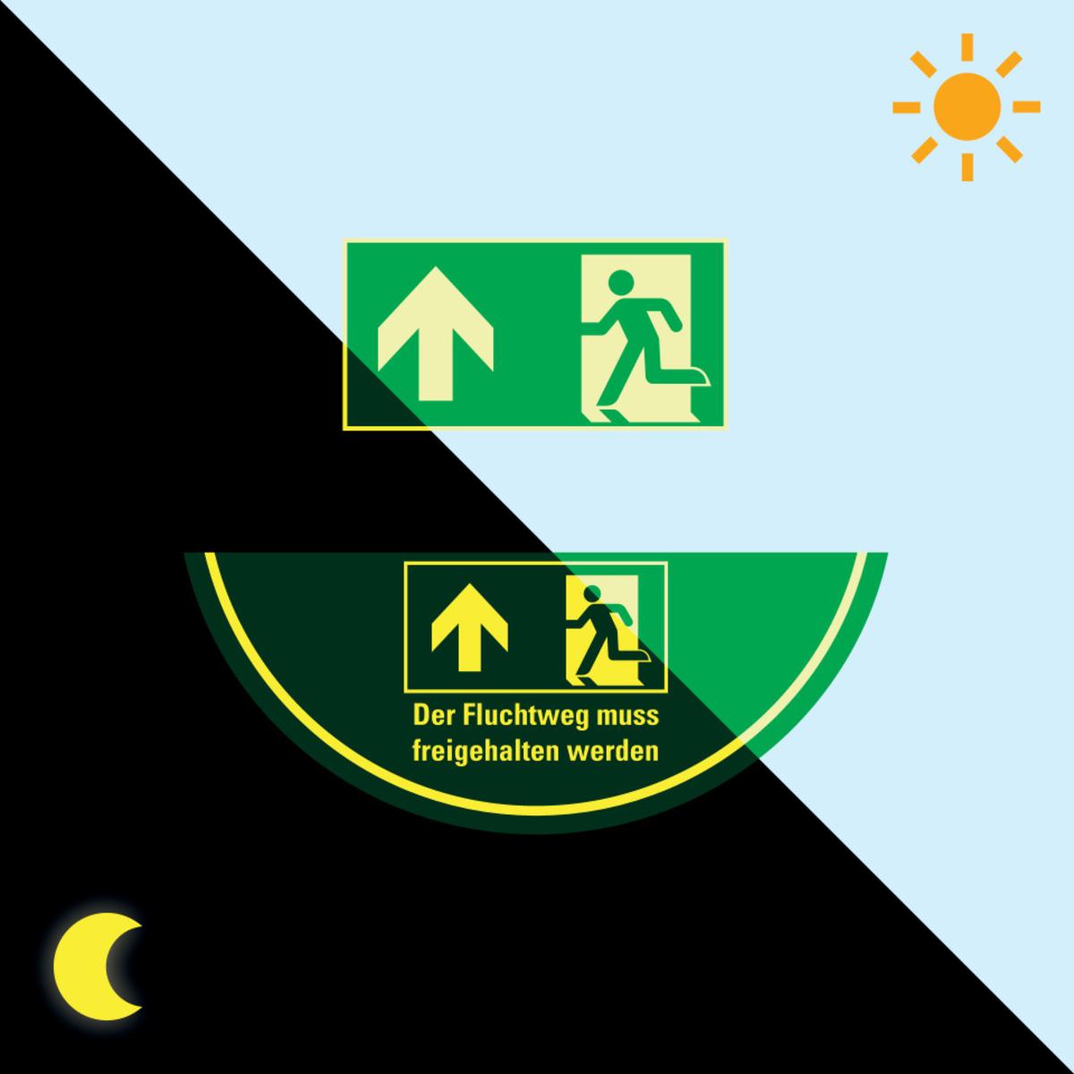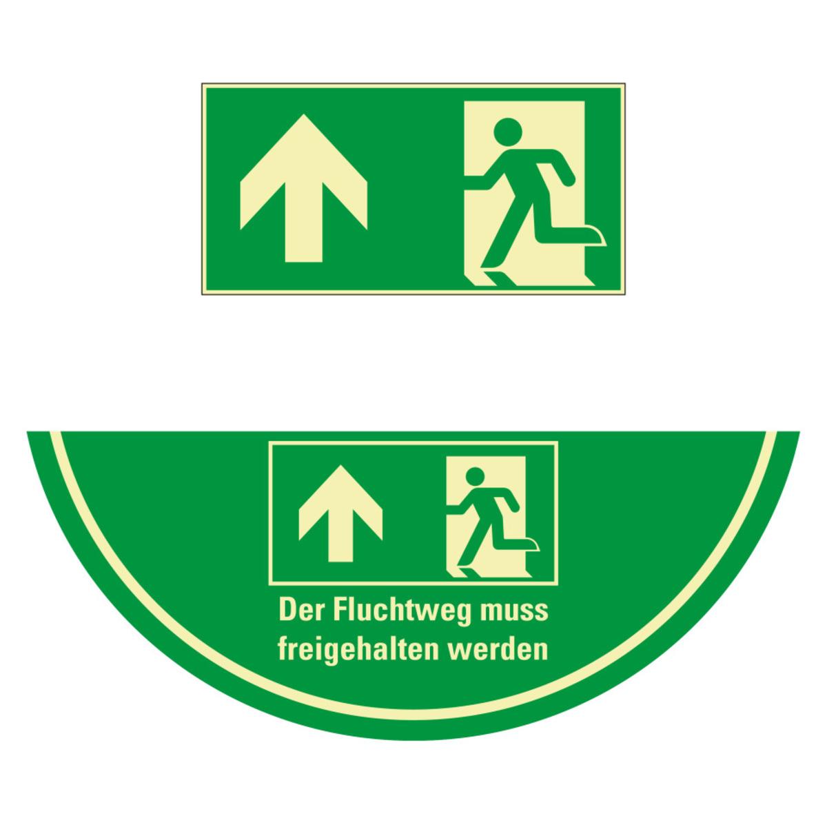 Vorteils-Set bestehend aus nachleuchtendem PERMALIGHT® Rettungszeichen und Bodenmarkierung mit Richtungsangabe "geradeaus"