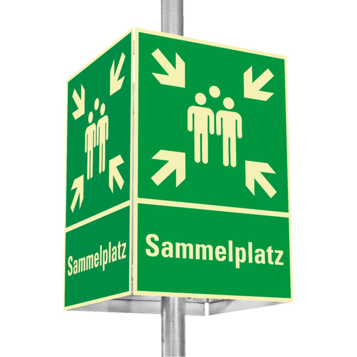 PERMALIGHT® power Würfelset Kombi-Rettungszeichen mit Rohrpfosten Würfel Sammelstelle ASR/ISO Aluminium inkl. Bohrungen