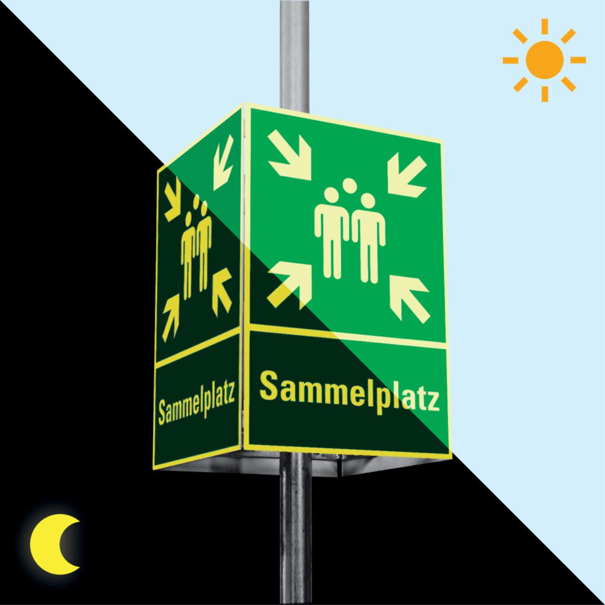Würfelset mit lang nachleuchtendem PERMALIGHT® Kombischild bestehend aus Rettungszeichen und Text "Sammelplatz", inkl. Befestigung und Rohrpfosten