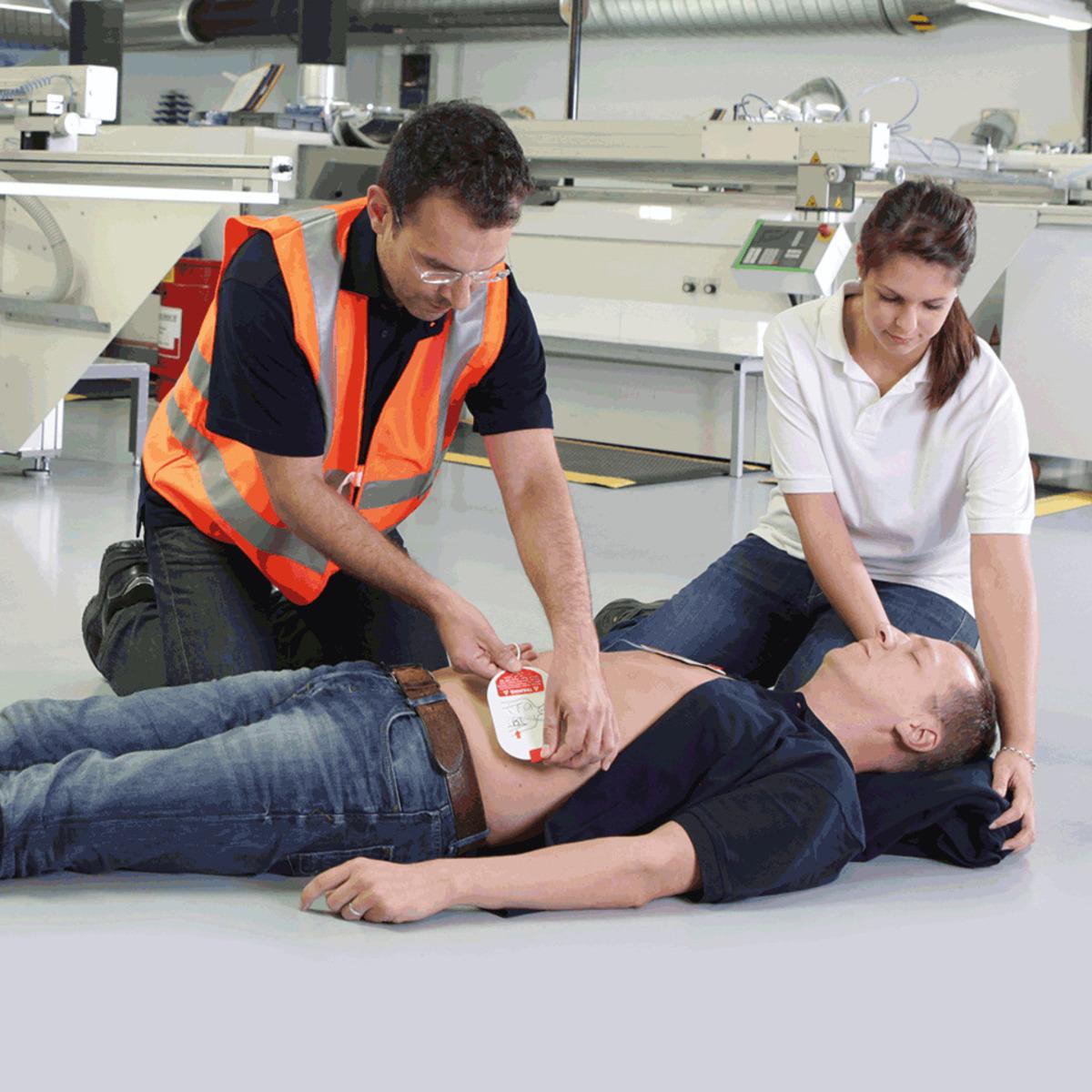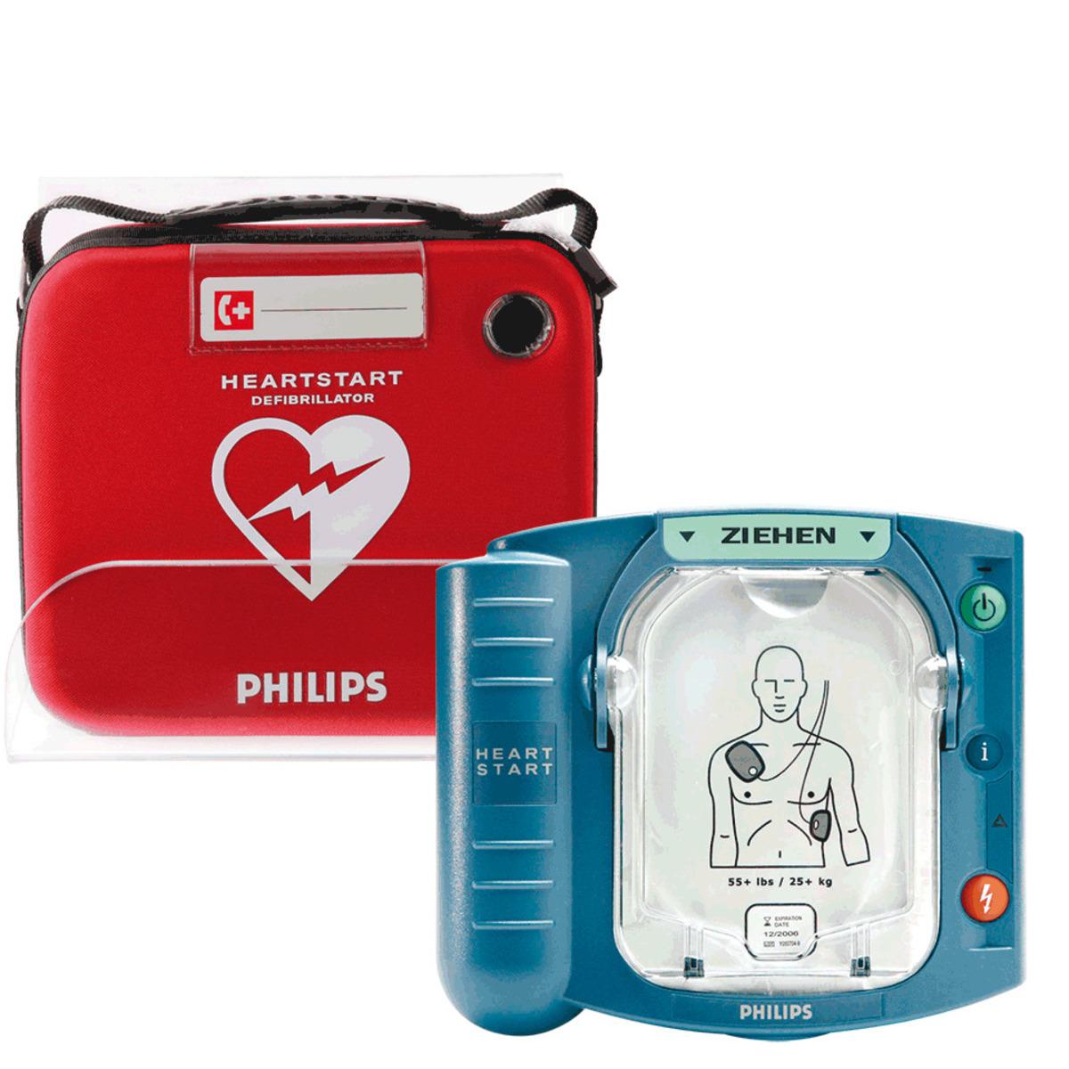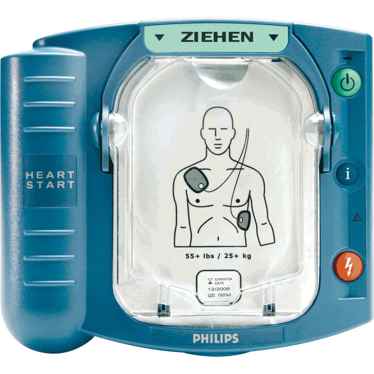 Defibrillator HeartStart HS1 mit vollautomatischer Analyse des Herzrhythmus und schneller Schockabgabe innerhalb von 8 Sekunden (Quick Shock). Einfache Sprachanweisungen leiten den Anwender durch die gesamte Bedienung (inkl. Herz-Lungen Wiederbelebung). Permanente Selbsttests garantieren die Einsatzbereitschaft. Integrierte Herzschrittmachererkennung, auch für Kinder geeignet.