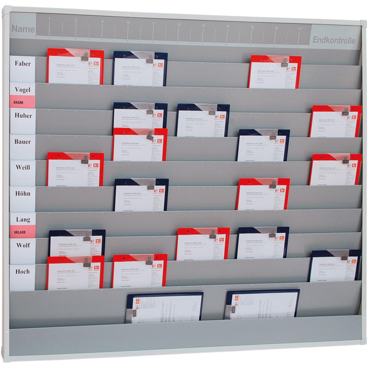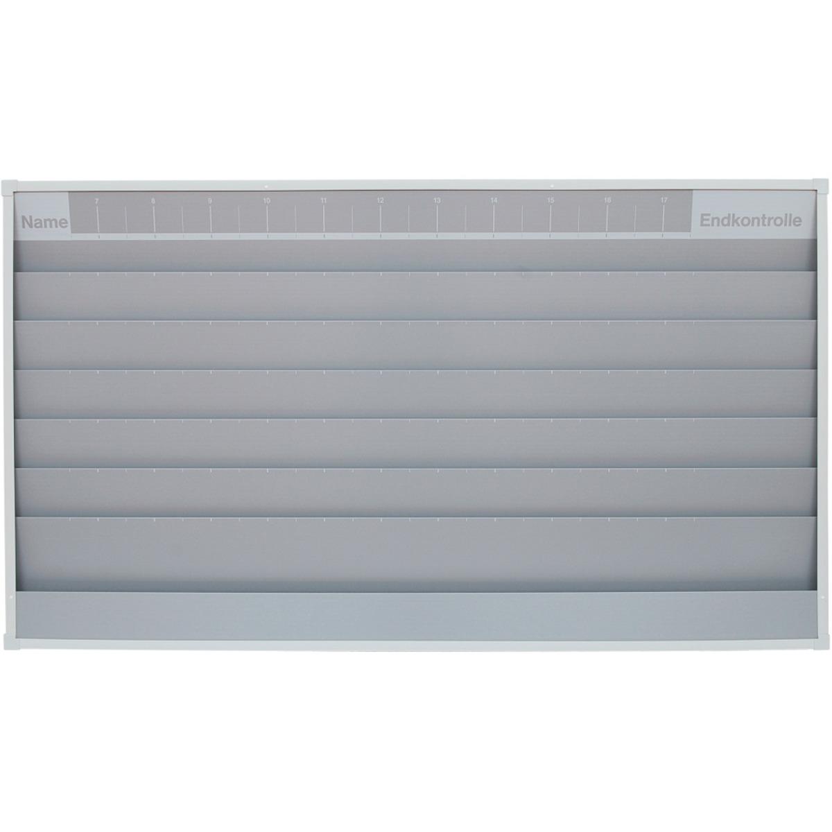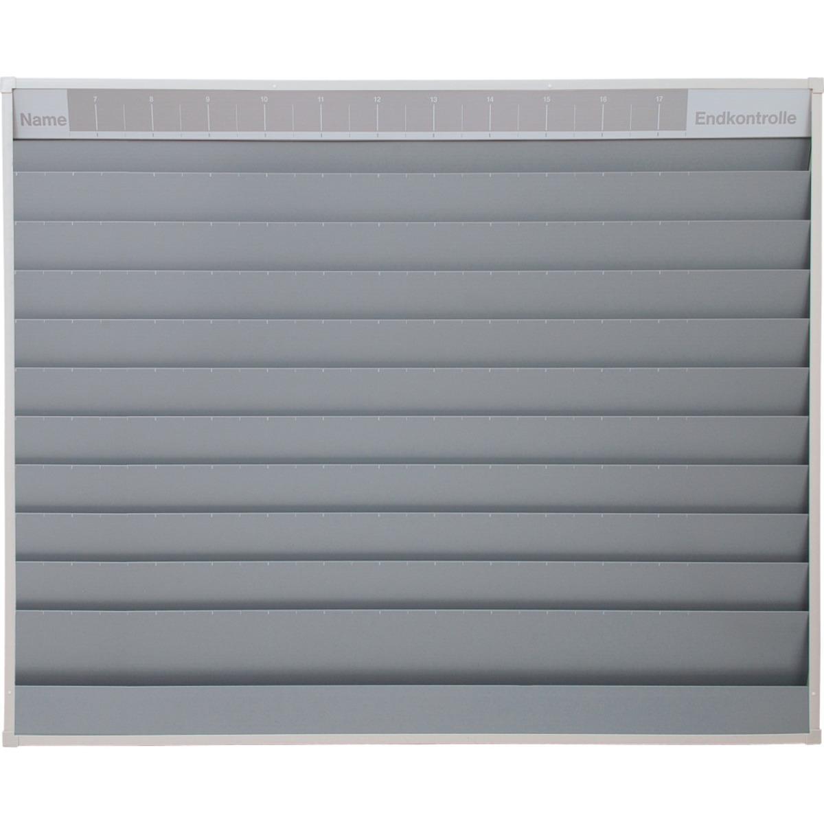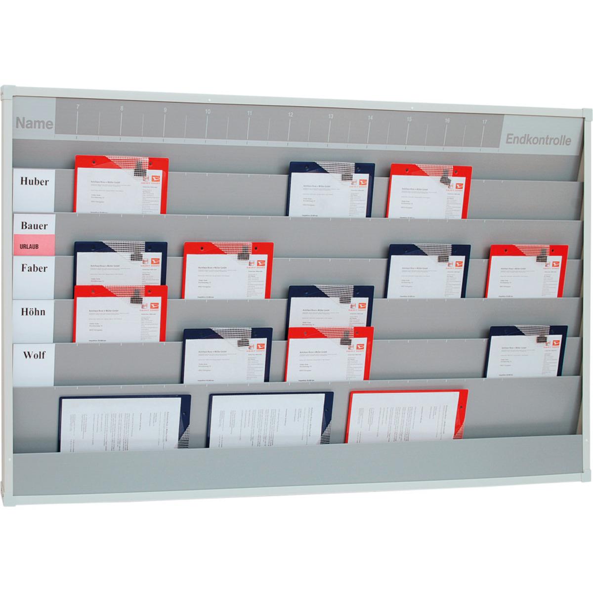 Planungstafel mit Zeitschema, fünfreihig, mit 6 oder 10 belegbaren Schienen und zusätzlichem Ablagefach, für DIN A4 Auftragstaschen geeignet, Planung nach Zeiteinteilung möglich, flexible Zuordnung nach Mitarbeiter oder Arbeitsbereich, schmutzabweisende Oberfläche, hochwertig, zeitloses Design