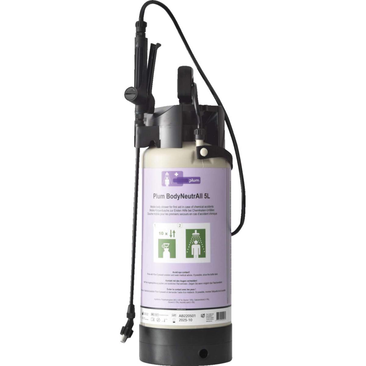 Mobile Körperdusche Plum BodyNeutrAll mit hochwirksamer Dekon-Lösung für Haut, Flächen und Bekleidung. Zur schnellen und wirksamen Dekontamination von Körper und Oberflächen bei Kontakt mit ätzenden und giftigen Gefahrstoffen, starke Säuren und Laugen, Oxydationsmittel, Formaldehyd, Phenol, organische Lösemittel, Flusssäure und Fluoride.