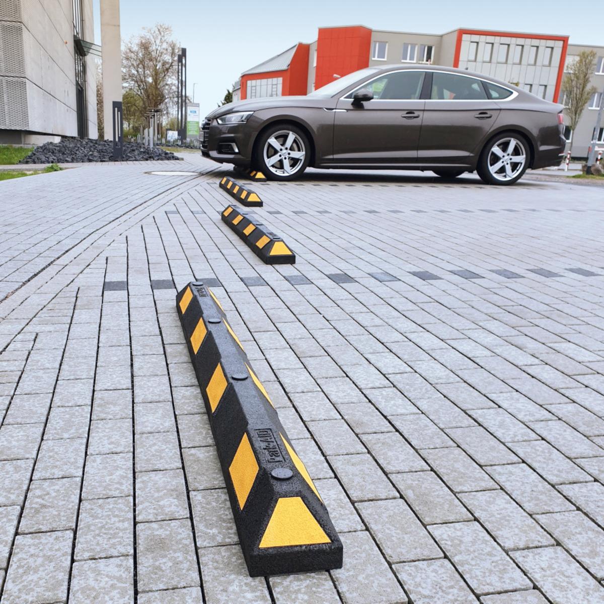 Radstopp welcher das Einparken erleichtert und für mehr Sicherheit sorgt. Geeignet als frontale oder seitliche Parkplatzbegrenzung. Für erhöhte Sichtbarkeit mit eingelassenen Reflextreifen.