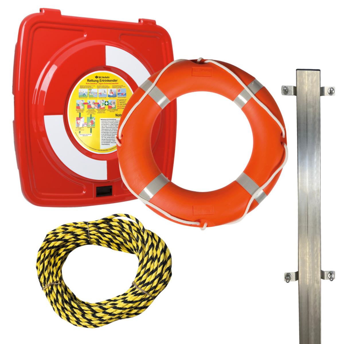 Auswahl: Rettungsring-Standgehäuse-Set, Kasten, Ring, Anleitung, Leine, Pfosten, Bef., 4 T/VE