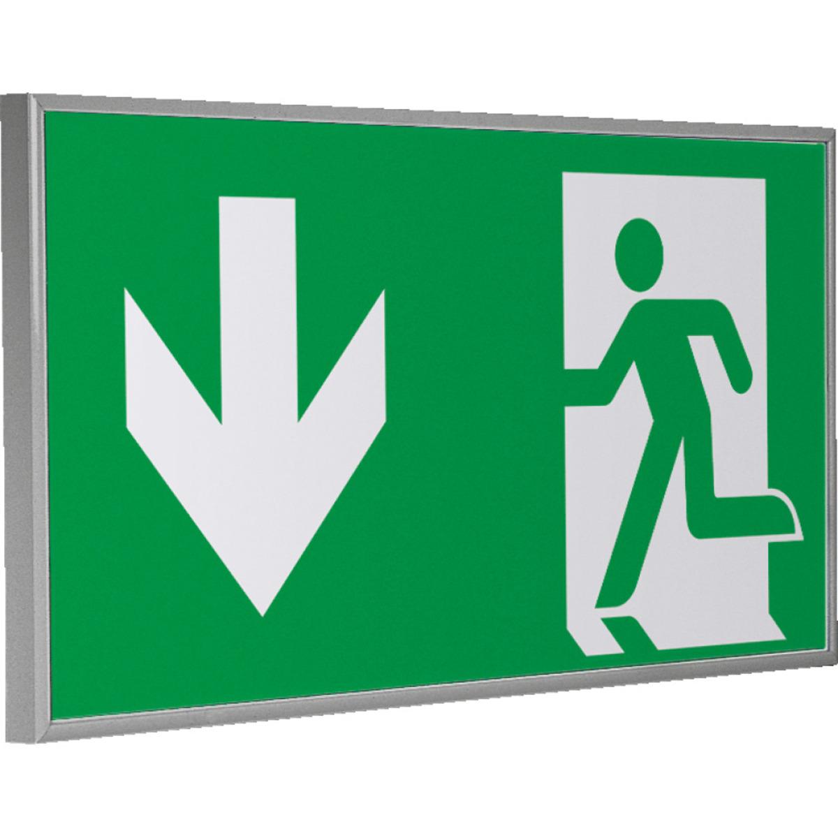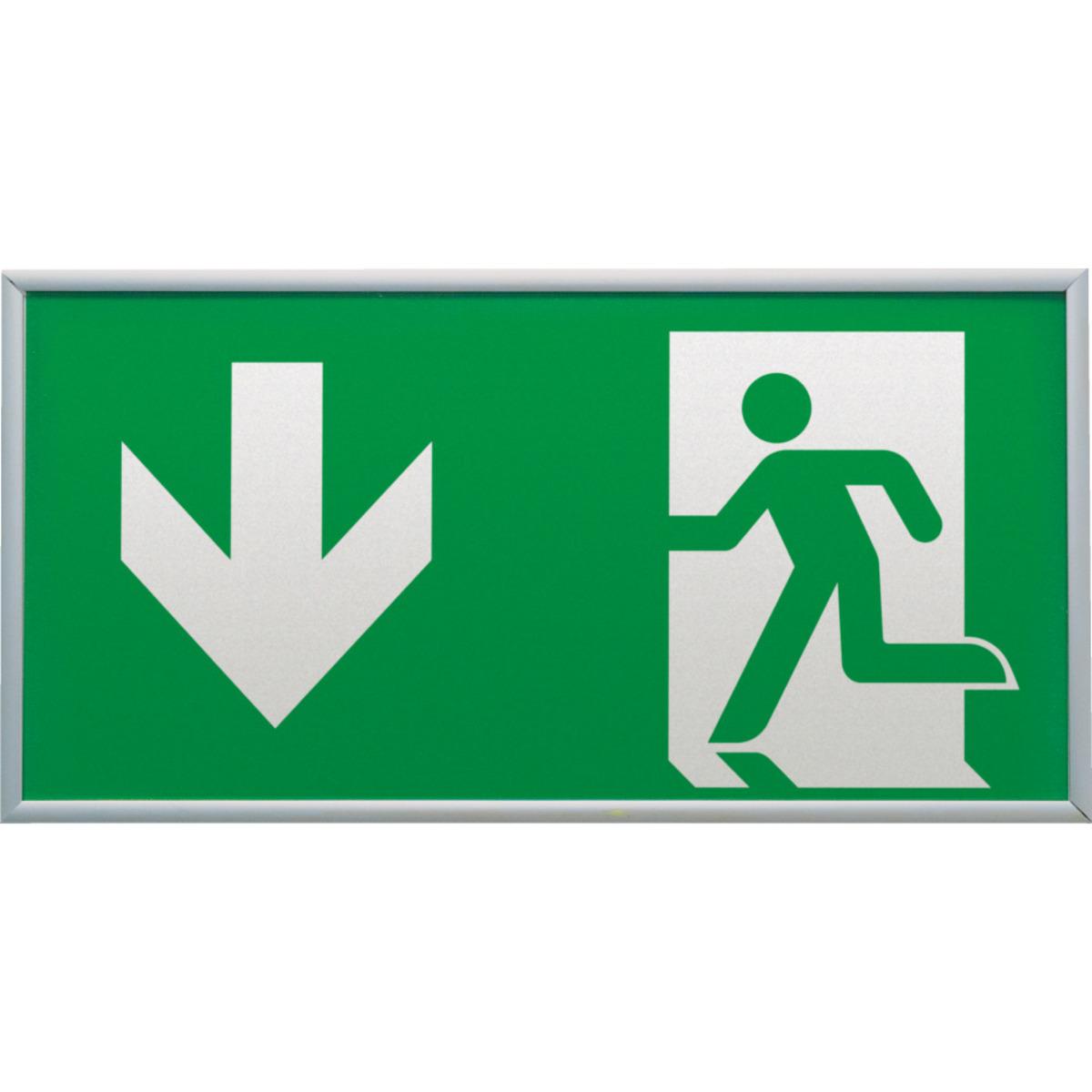 Rettungszeichen im Rahmen Notausgang, Richtungspfeil unten ASR/ISO Acrylglas, Aluminium, Kunststoff Befestigungsmaterial