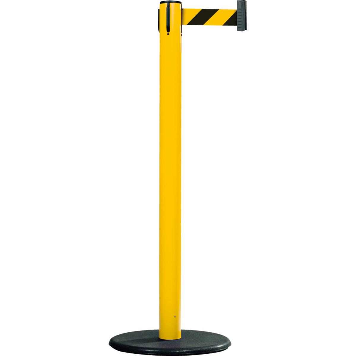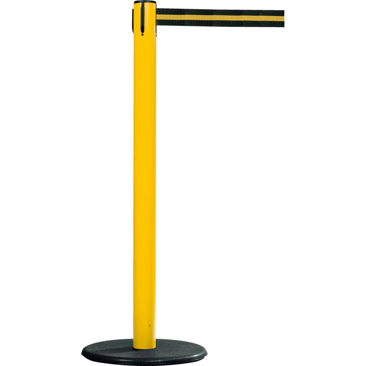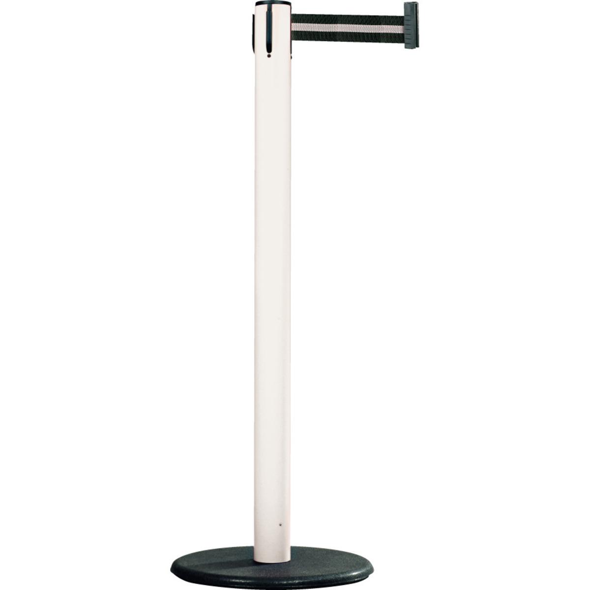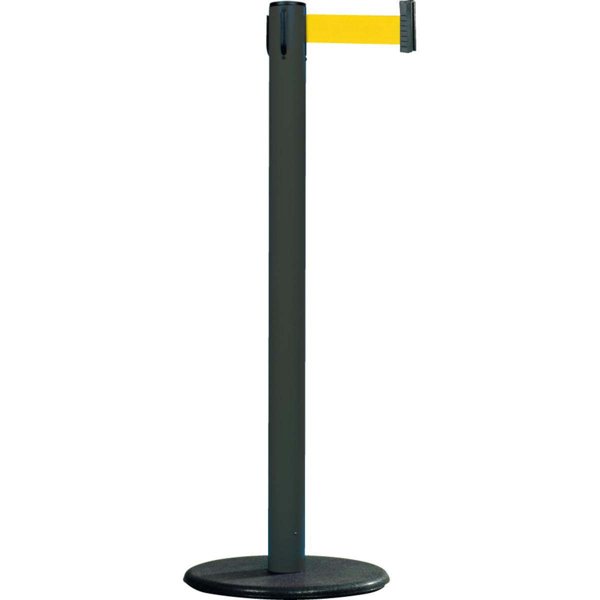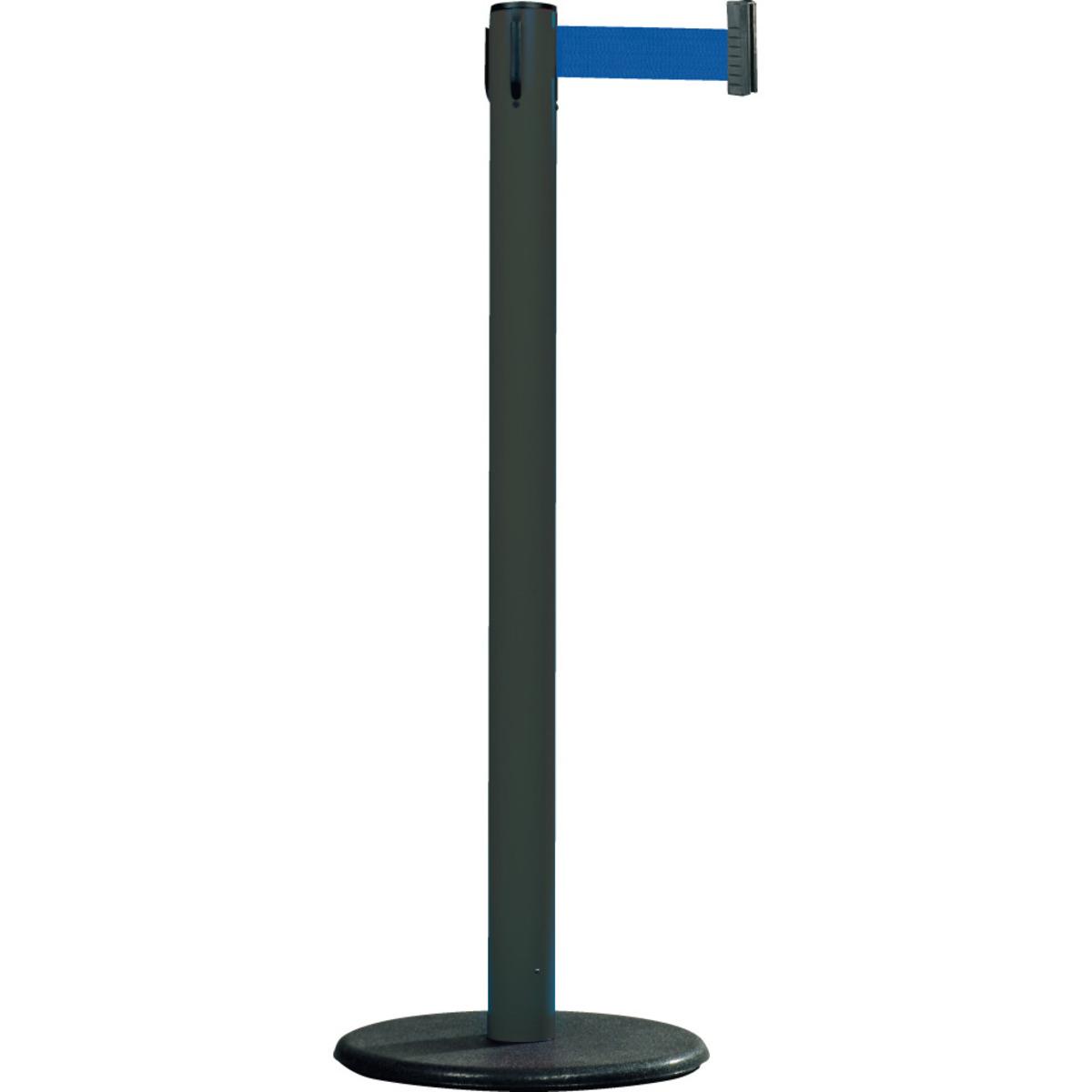 Gurt-Absperrpfosten Indoor zm schnellen Absperren oder Leiten von Besuchern, stabiler und überfahrbarer Bodenteller, stufenlos ausziehbarer Gewebegurt mit Aufrollautomatik und Panikverschluss.