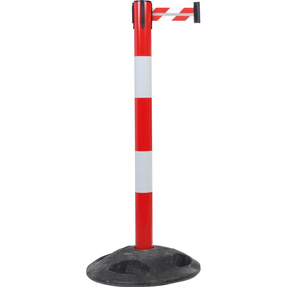 Reflektierender Gurt-Absperrpfosten Outdoor zum schnellen Absperren oder Leiten von Besuchern, mit Reflexfolie für mehr Sicherheit bei schlechten Lichtverhältnissen, stabiler und überfahrbarer Bodenteller, stufenlos ausziehbarer Gewebegurt mit Aufrollautomatik und Panikverschluss, Auszugslänge bis zu 3,5 Meter, 3 Jahre Garantie auf Aufrollmechanismus und Gurtqualität
