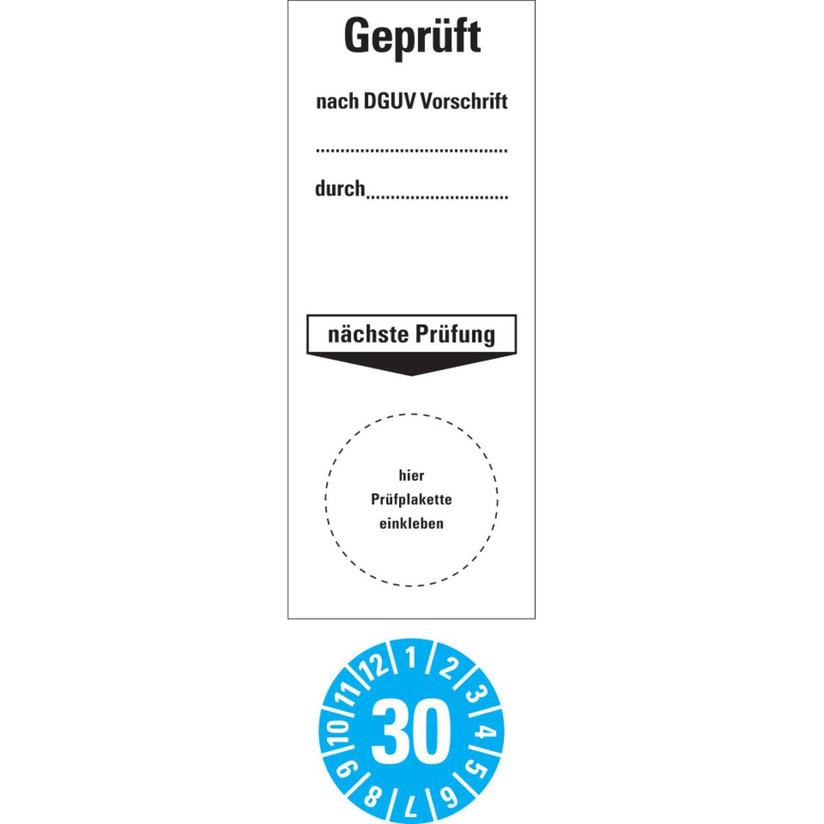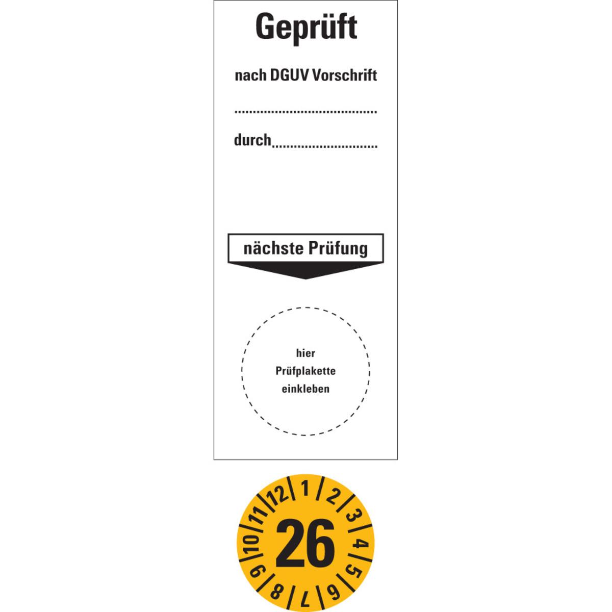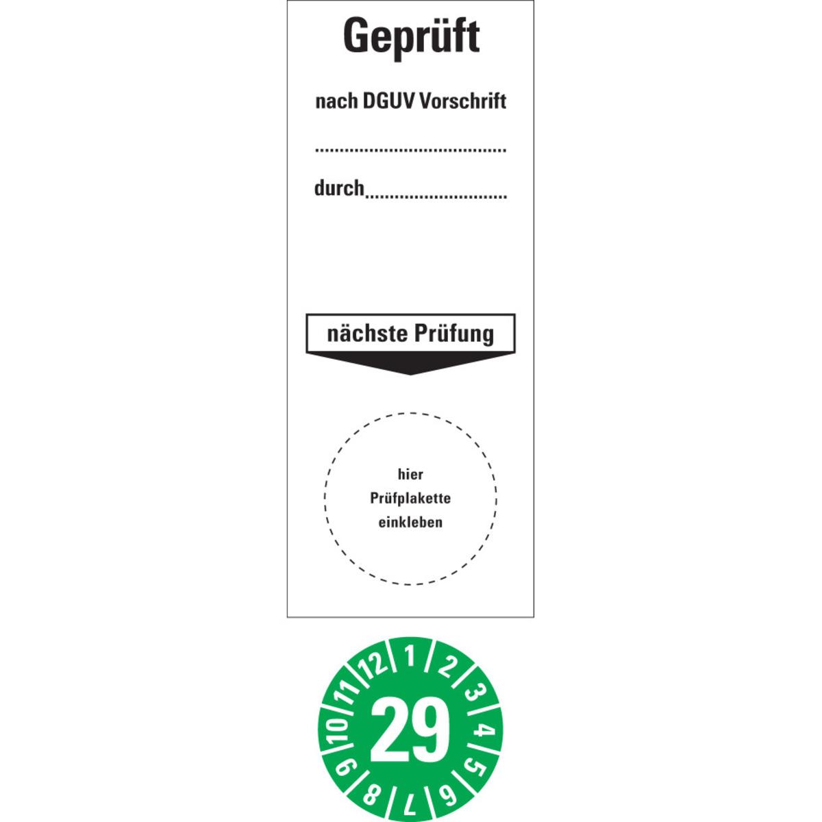 Sammelbogen bestehend aus Grundetikett mit Text "Geprüft nach DGUV Vorschrift...durch...nächste Prüfung" und passender Prüfplakette