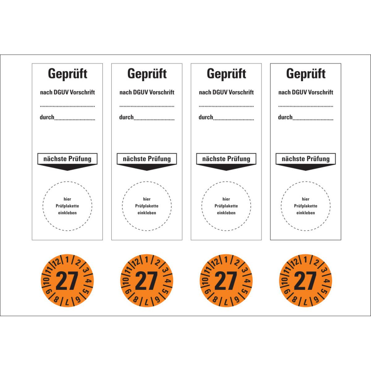 Auswahl: Sammelbogen Grundetikett Geprüft nach DGUV Vorschrift durch... NP 27, orange