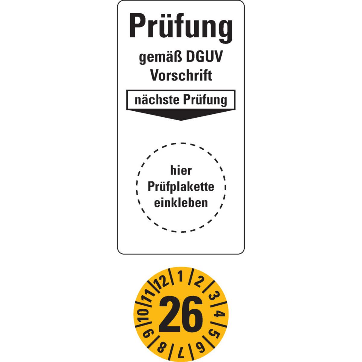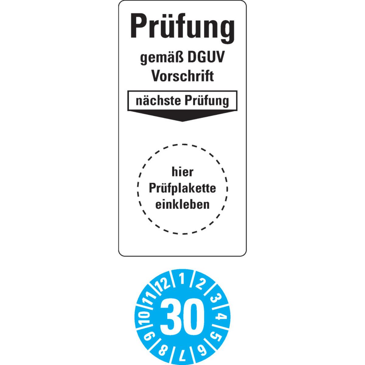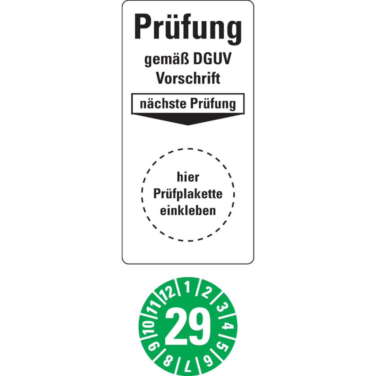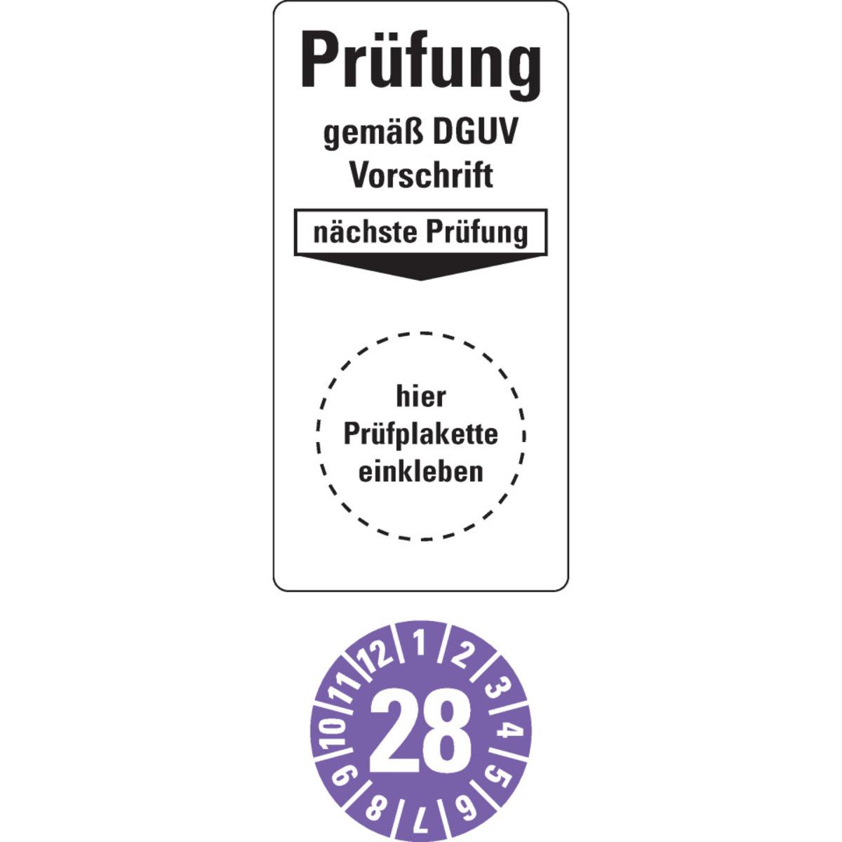 Sammelbogen bestehend aus Grundetikett mit Text "Prüfung gemäß DGUV Vorschrift - nächste Prüfung" und passender Prüfplakette